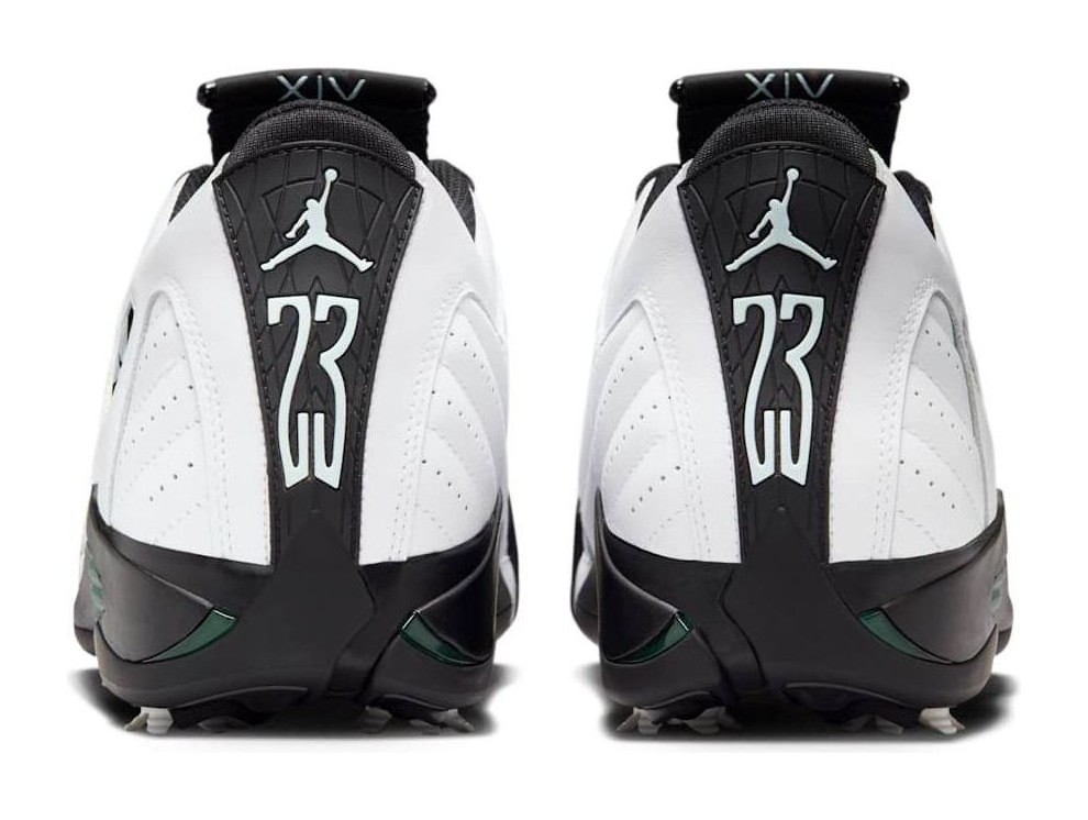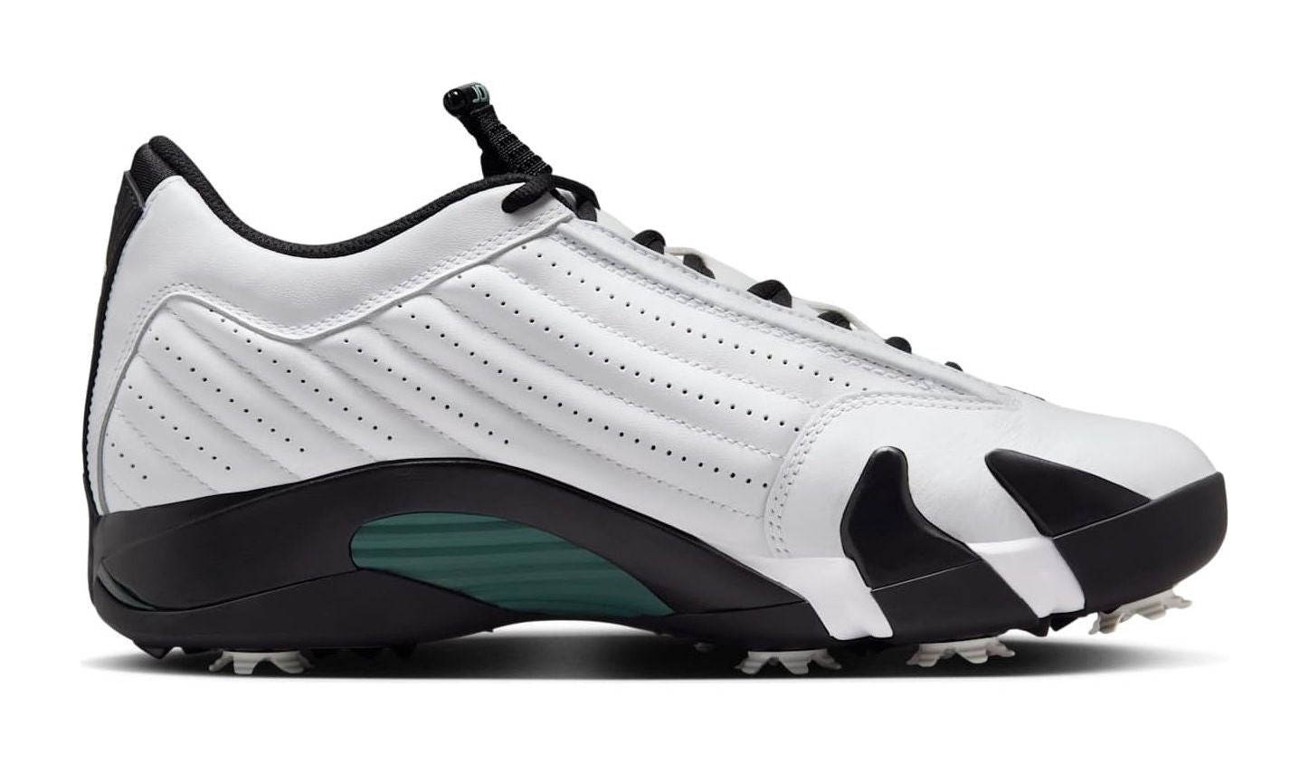 This is a golf shoe adaptation of the original "Oxidized Green" Air Jordan 14 colorway. It features a White leather upper, often including perforated side panels and subtle stitched detailing, which retains the look of the classic basketball shoe. The sneaker's most notable color accents are the Oxidized Green and Glacier Blue found on the Ferrari-inspired shield logo, the Jumpman logos on the toe and heel, and the TPU shank plate. The shoe is engineered for the golf course, replacing the traditional rubber outsole with a golf-specific plate that features seven removable spikes for enhanced traction.
