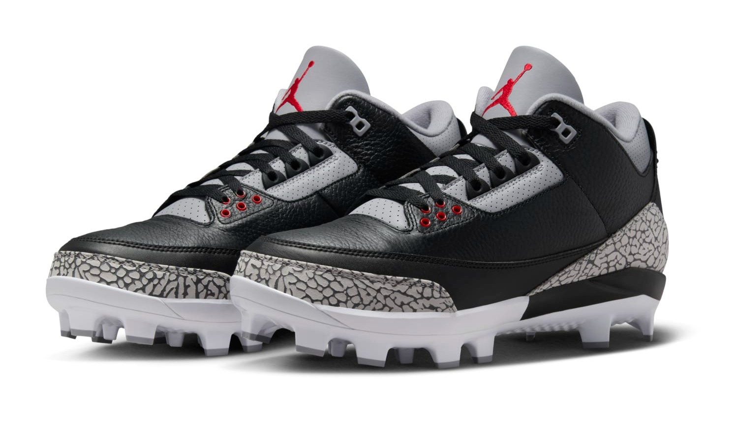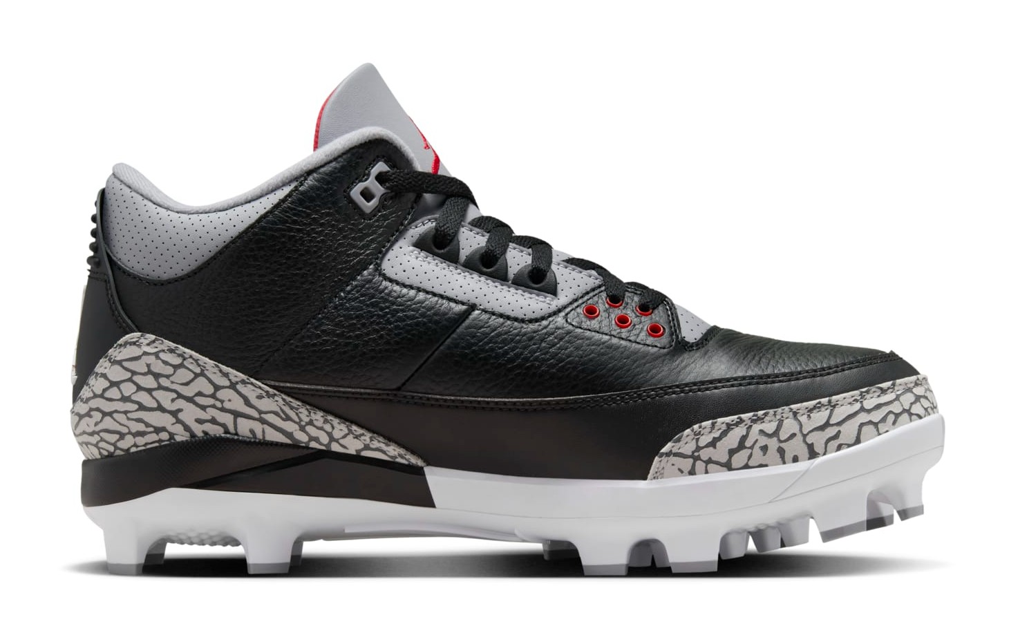 The Air Jordan 3 Retro MCS Cleat 'Black Cement' is a men's athletic cleat, borrowing the design and color scheme from the classic Air Jordan 3 sneaker. The cleat is constructed with a Black tumbled leather upper and the iconic Cement Grey elephant print wrapping around the toe and heel. Fire Red accents highlight the Jumpman logo embroidered on the tongue and are used for the round eyelets. The shoe is adapted for the field with a molded cleated outsole for traction in sports like baseball or football. The cleat maintains the mid-top silhouette and overall aesthetics of the Air Jordan 3, replacing the traditional rubber cup sole with a functional cleat plate.