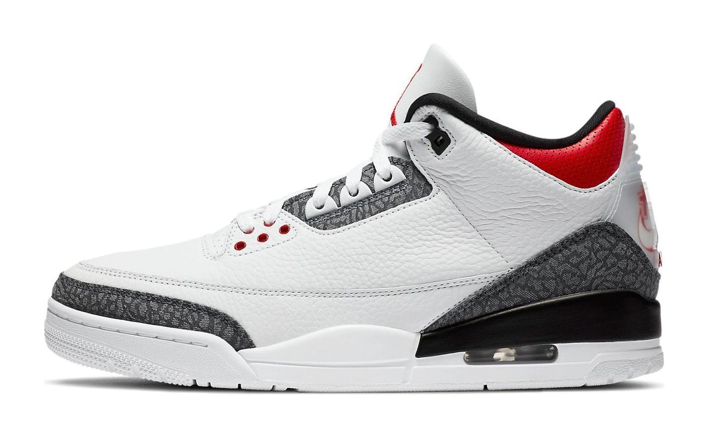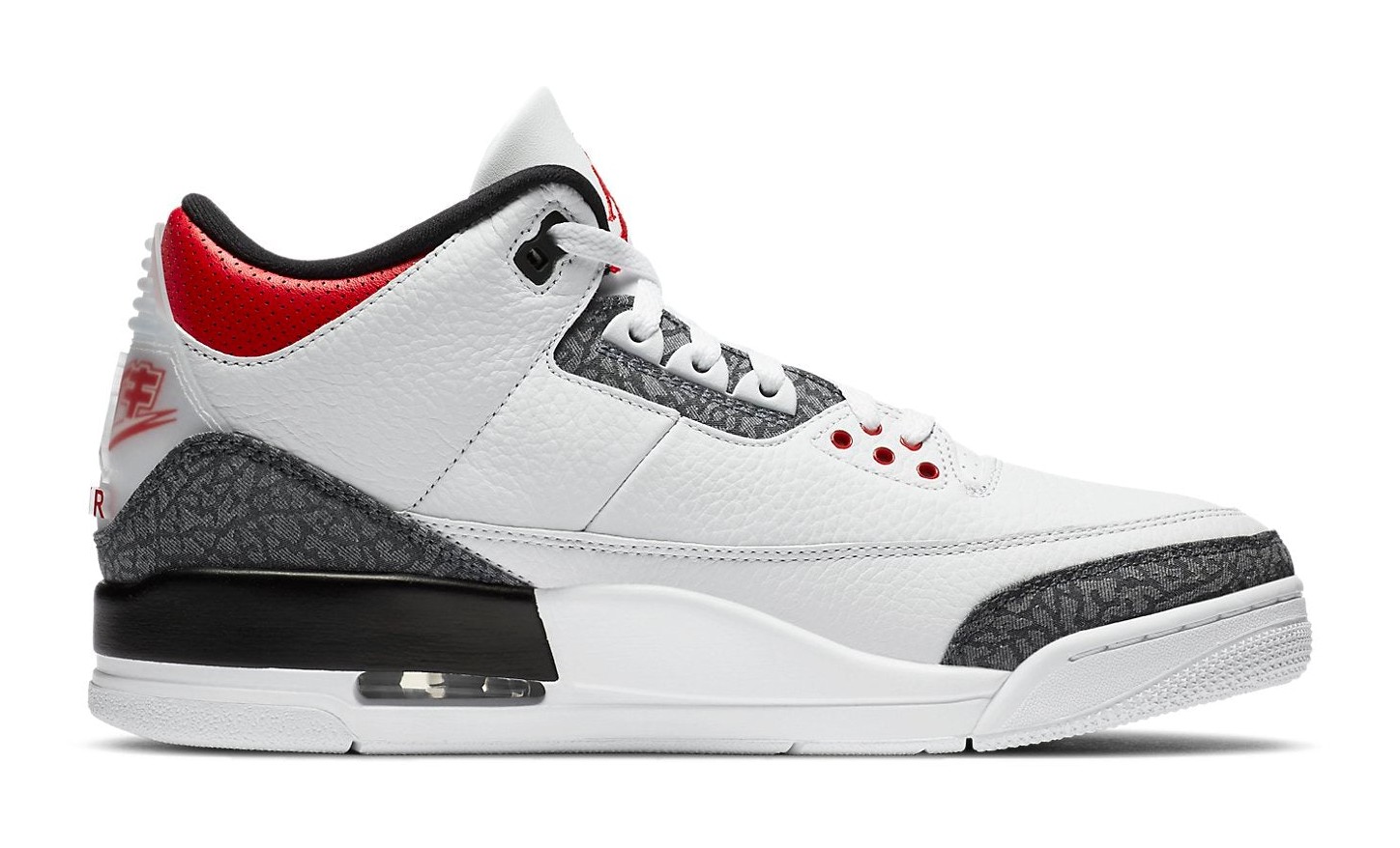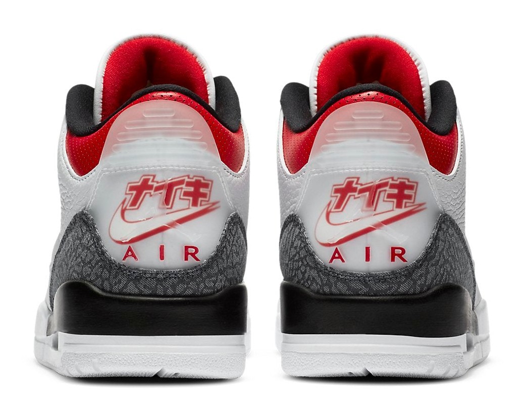The "SE" in the model name stands for "Special Edition," and the "-T" (sometimes seen as "SE-T") refers to the specific tooling/design for this exclusive release. The "CO.JP" refers to the "Concept of Japan" exclusive series. This sneaker features a white tumbled leather upper, but the iconic elephant print overlays on the toe and heel are replaced with raw indigo denim, a nod to Japan's celebrated premium denim. The standout feature is the translucent heel tab, which beneath the Jumpman logo, features the Nike Air branding in Japanese Kanji characters, distinguishing it from the wider global release of the "Fire Red Denim" Air Jordan 3. Fire Red accents highlight the tongue liner, eyelets, and part of the midsole.