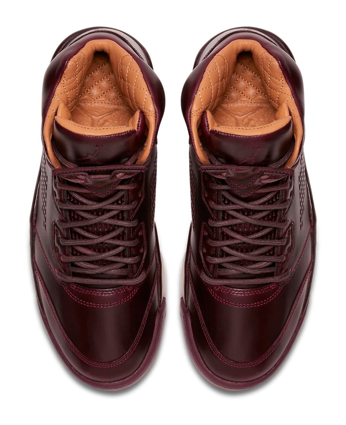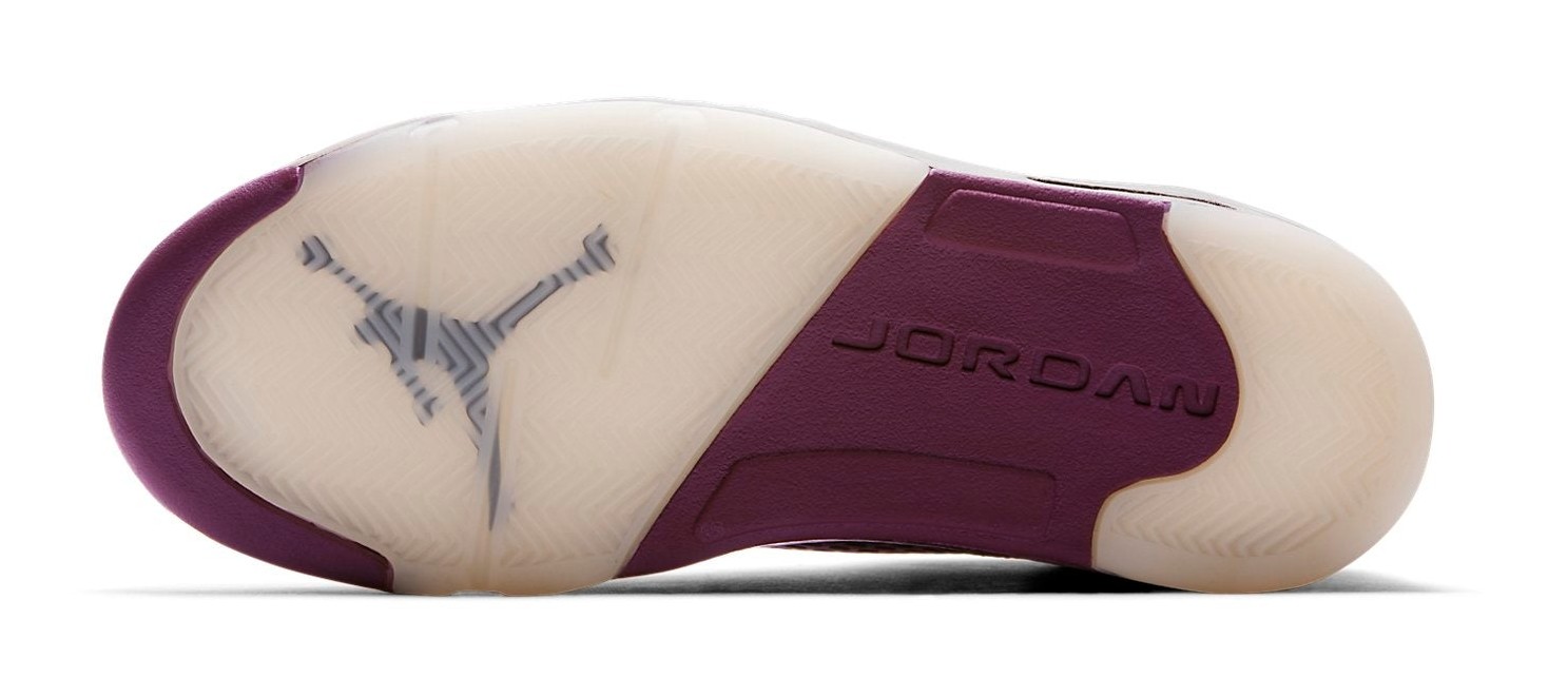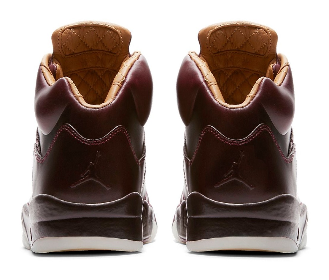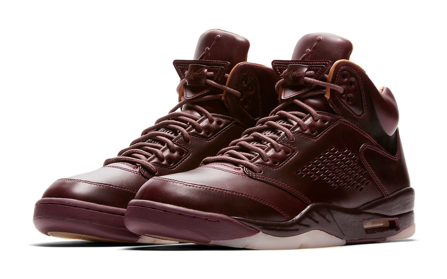 The Air Jordan 5 Retro Premium "Bordeaux" delivers a sophisticated, monochromatic look using only premium materials. The entire upper is dressed in a deep, rich burgundy color known as Bordeaux, constructed from high-quality leather. In a departure from the traditional Air Jordan 5 design, the signature side mesh netting is replaced with perforated lines in the same leather for a cleaner, luxurious aesthetic. The interior lining and insole are crafted from quilted Vachetta leather in a tan or gold (Elemental Gold) color, providing an ultra-plush feel. The shoe is completed with a milky white/translucent Sail rubber outsole for contrast and a matching Bordeaux midsole. The colorway is often nicknamed "Wine" due to its rich, deep red hue.