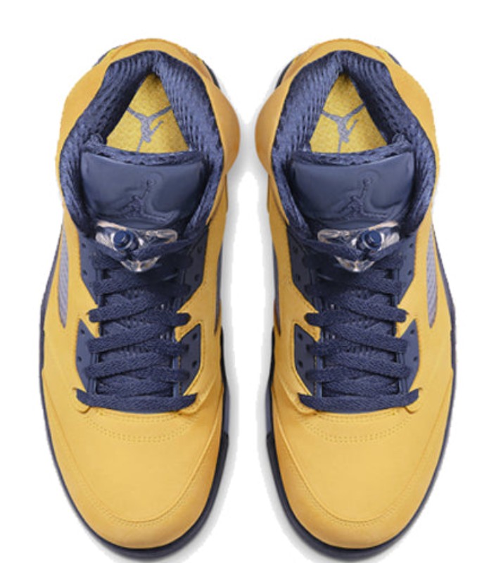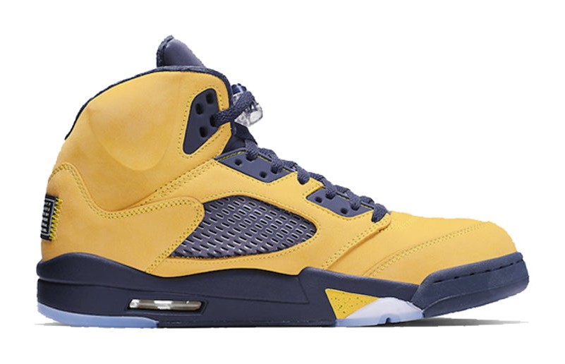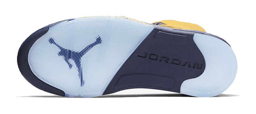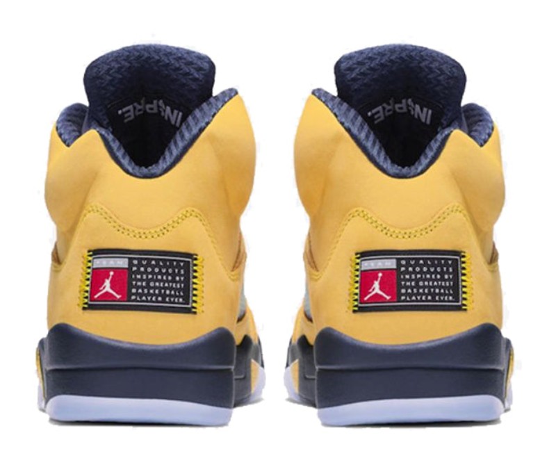 The Air Jordan 5 Retro SP 'Michigan' pays tribute to the University of Michigan Wolverines, one of the schools sponsored by Jordan Brand. The shoe features an upper constructed entirely of bright Amarillo (yellow) nubuck, which is reminiscent of the 'Lightning' Air Jordan 4. College Navy accents are used on the midsole, tongue lining, and laces, completing the Michigan Wolverines team colors. Unique features include a tag stitched onto the heel in place of the usual Jumpman logo that reads "Team Jordan," a reflective tongue, and the word "Inspire" printed on the inner side of the tongue. The midsole features the signature shark-tooth detailing with a yellow speckled pattern.