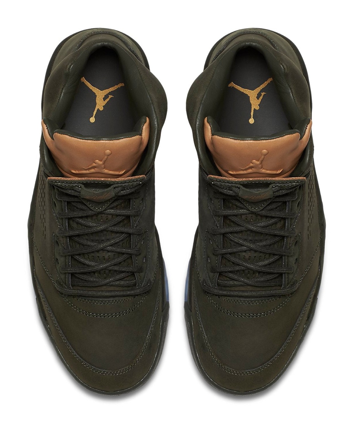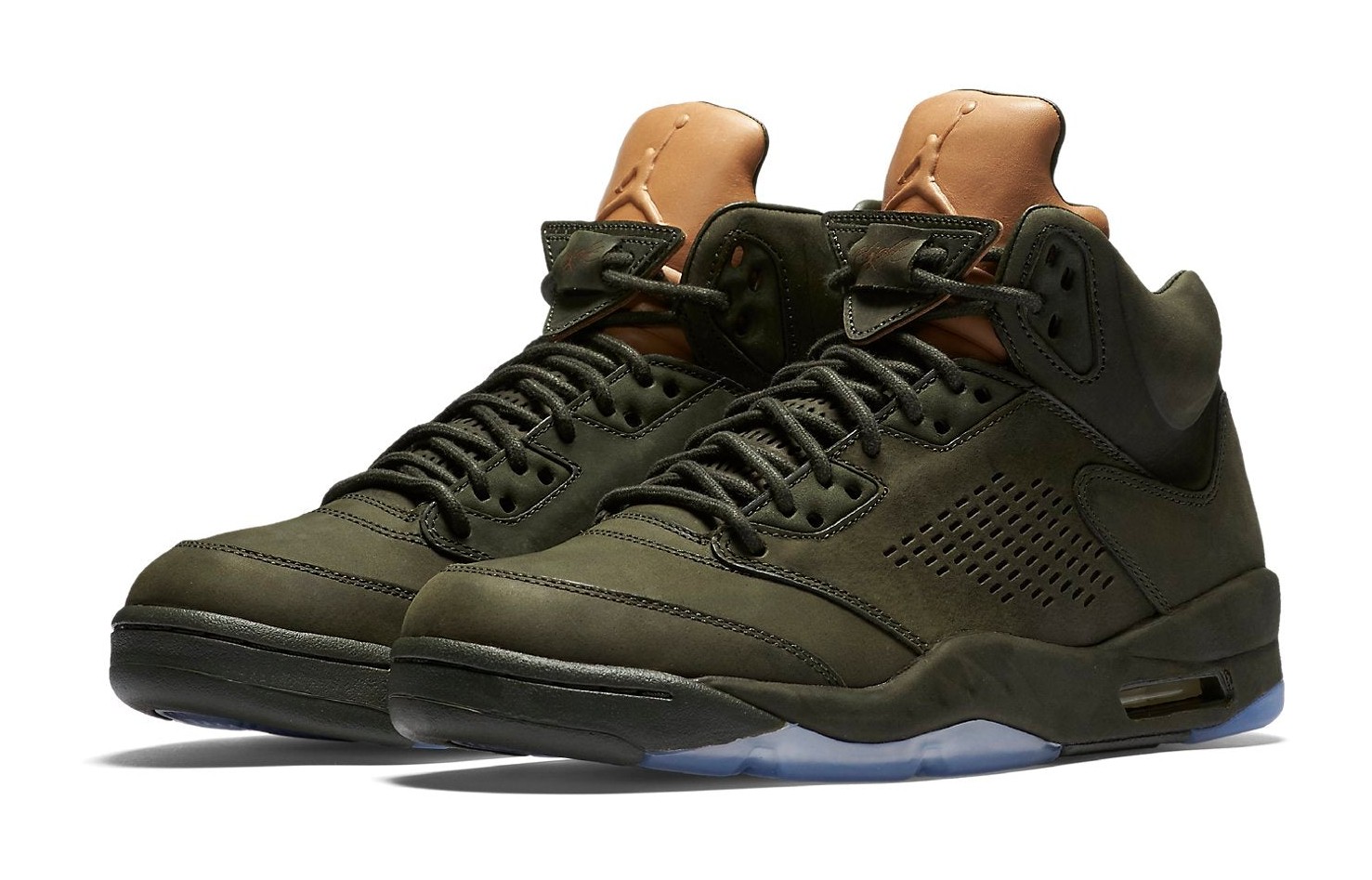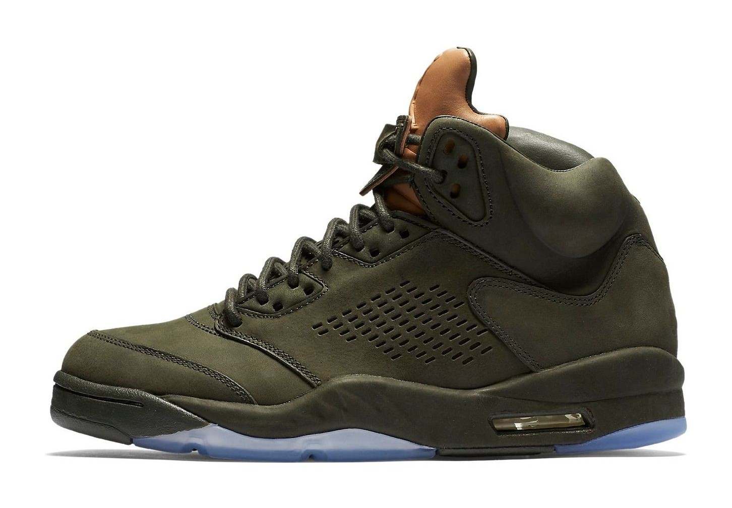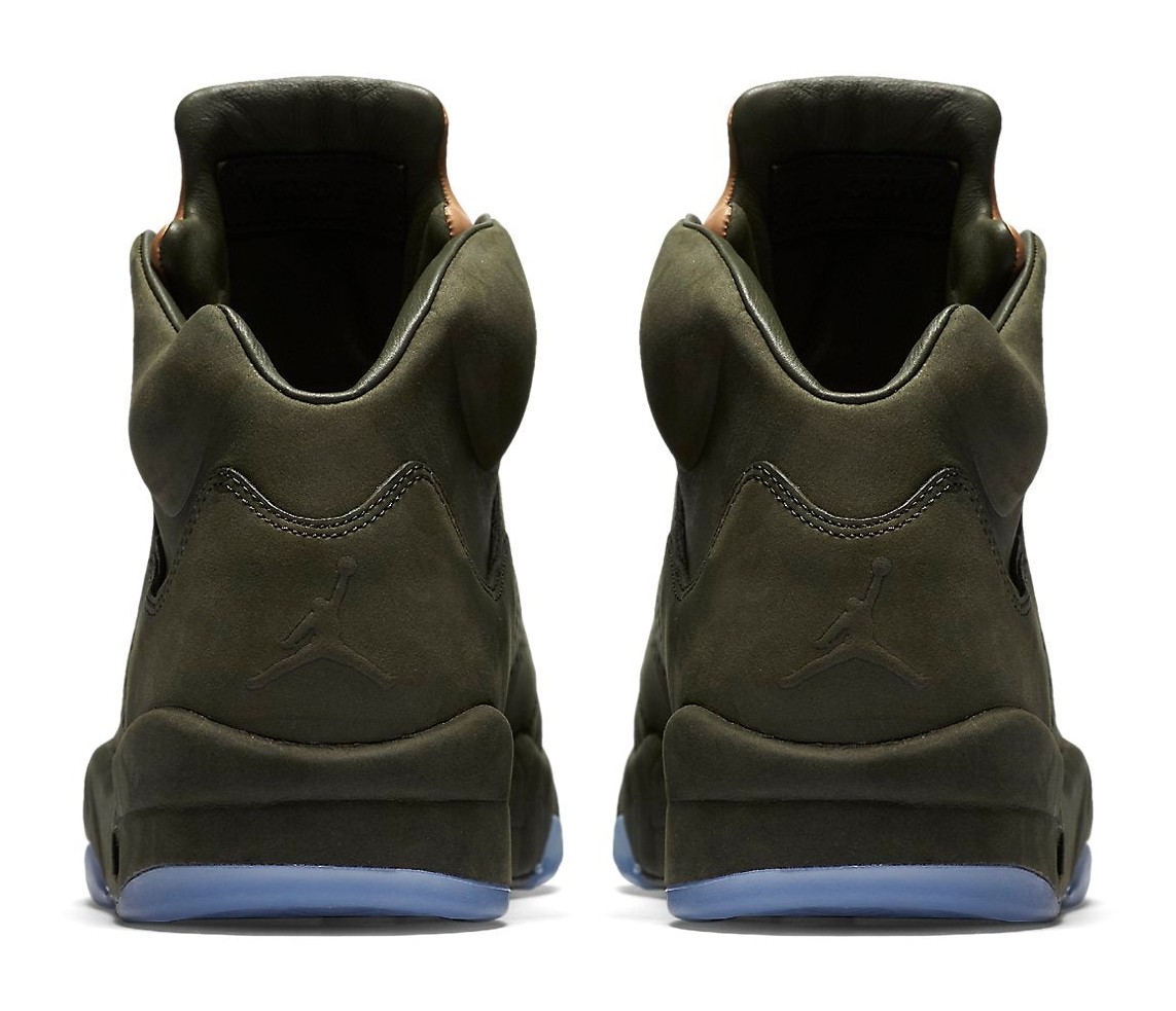The Air Jordan 5 Retro Premium "Take Flight" is inspired by the classic World War II P-51 fighter plane and its accompanying flight bomber jackets. The upper is constructed with a rich, single-piece of premium Sequoia (a deep olive green) leather, replacing the traditional mesh netting for a refined, boot-like aesthetic. The tongue and ankle lining feature supple Vachetta Tan leather, which is designed to age and darken over time, contrasting the military green perfectly. The shoe utilizes leather "Flight" lace locks and sits on a Sequoia-colored midsole with an icy translucent outsole. This model's luxurious materials and color scheme give it a rugged yet sophisticated appeal.
