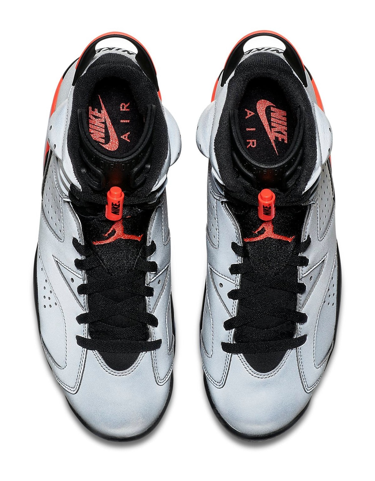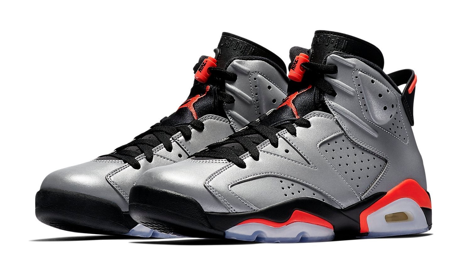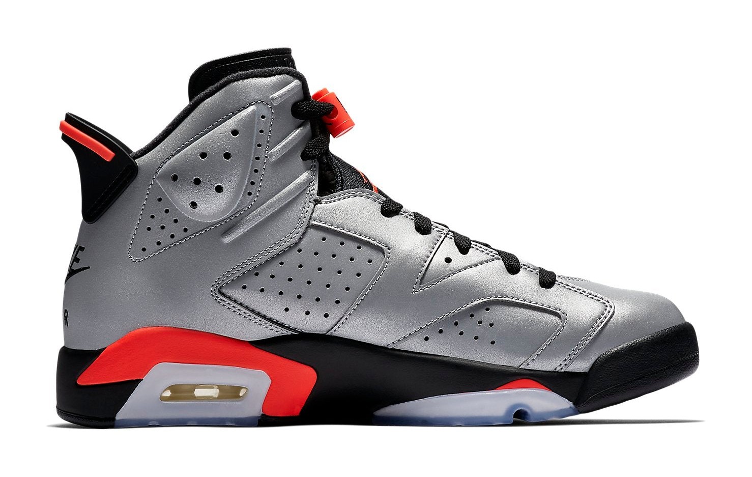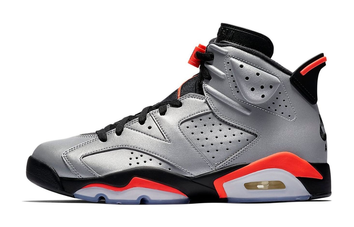 This sneaker celebrates the Air Jordan 6 that Michael Jordan wore during his first championship in 1991, but with a dramatic twist. The entire upper is constructed from a Reflect Silver 3M reflective material, which lights up under direct light. Key accents from the original "Infrared" colorway are carried over, including the Bright Crimson (Infrared) detailing on the lace lock, the heel spoiler, and sections of the midsole. The design is completed with black on the tongue and midsole, and a signature icy blue translucent outsole. It was released alongside the Air Jordan 7 and Air Jordan 8 as part of the "Reflections of a Champion" pack.