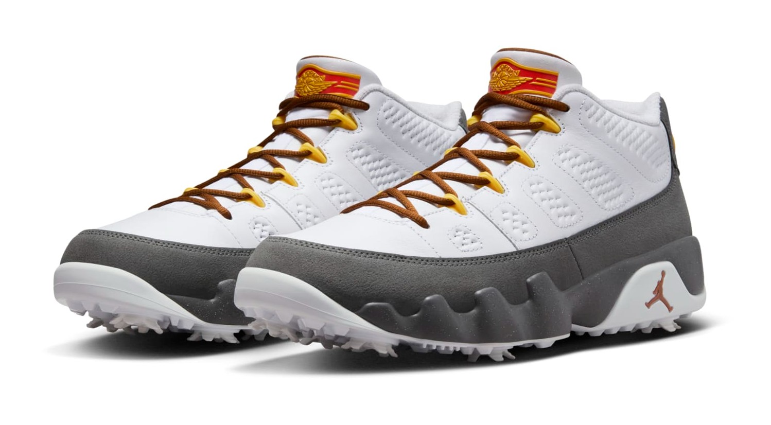 This golf-ready sneaker from the Jordan Brand transforms the Air Jordan 9 into a low-cut silhouette for the course, released as an NRG (energy) drop to celebrate the US Open golf tournament being held at Pinehurst Resort in North Carolina in 2024. The shoe features a clean White leather upper with accents of Cool Grey and Anthracite on the midsole, tongue, and heel, providing a sophisticated look suitable for the course. Pops of vibrant University Gold are used on the branding, such as the Jumpman logo and insole, which may be a nod to the tournament's location or the official US Open colors. The model features a waterproof upper and a strong plastic plate with seven removable Champs spikes for superior traction.