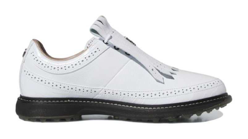 This model is a golf shoe created in partnership with Macklemore's brand, Bogey Boys, which focuses on vintage-inspired golf apparel. It takes the classic look of a heritage sneaker and adapts it for the golf course with a spikeless rubber outsole for traction. The upper is predominantly Cloud White with a classic leather look. Core Black is used for the tongue, collar, and sole detailing, while Dark Silver Metallic provides a subtle shine on the adidas branding, balancing vintage aesthetics with modern golf performance.
