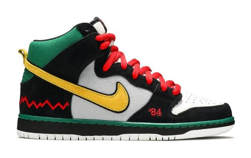 The Nike SB Dunk High Pro Premium 'McRad' is a vibrant and commemorative release that honors Chuck Treece, the legendary skater and musician for the '80s hardcore punk band McRad, and the first African-American skater to be featured on the cover of Thrasher Magazine in 1984.