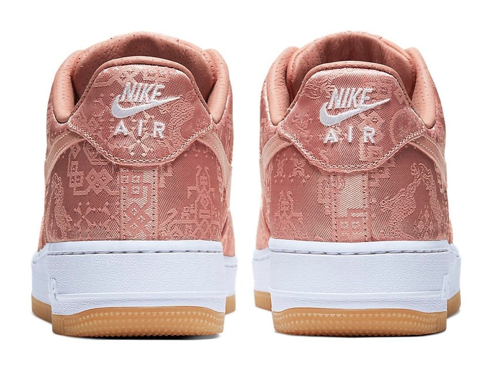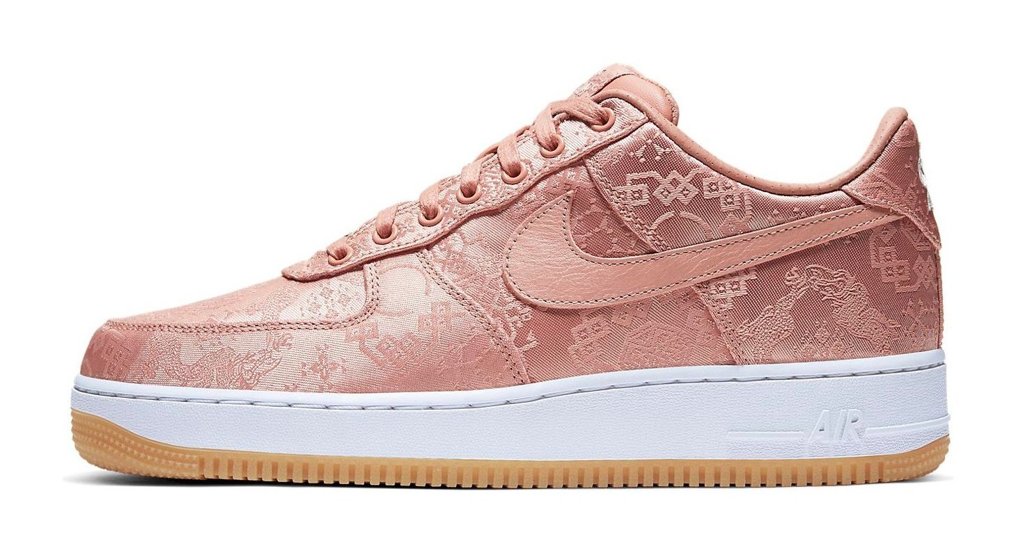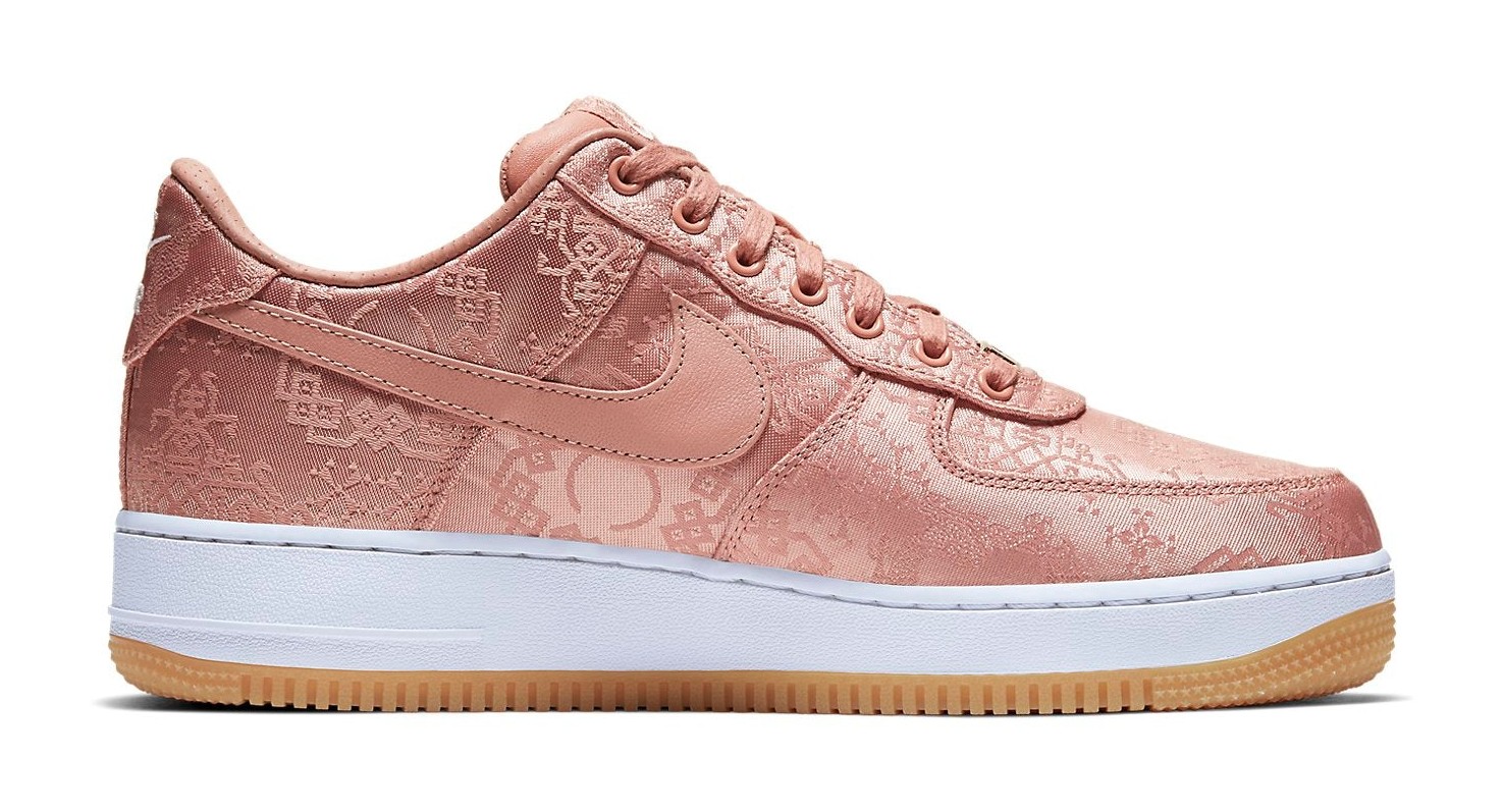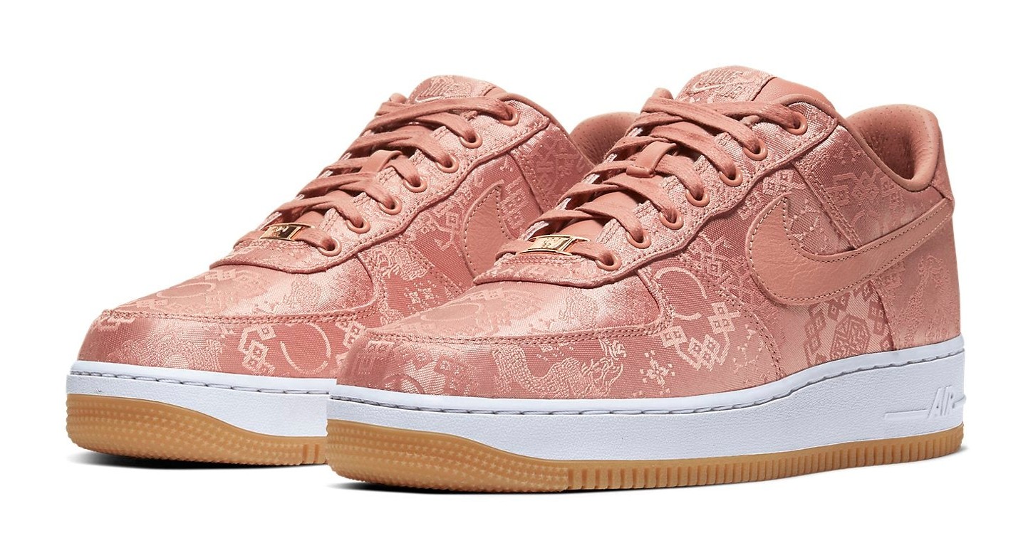 This sneaker features a "tear-away" upper constructed from a luxurious, rose gold-colored silk, intricately embroidered with traditional Chinese patterns, known as the 'Silk Royale' design. The silk is meant to be worn away or intentionally torn to reveal a second, darker leather layer underneath, reflecting CLOT's theme of bridging Eastern and Western cultures. The shoe is completed with a clean white midsole and a classic gum rubber outsole.