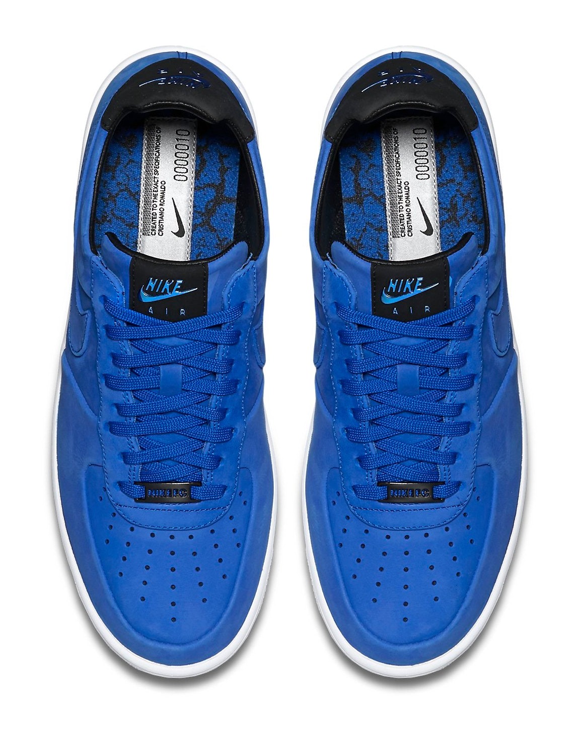 This is a special edition of the lightweight Air Force 1 Ultraforce Low, dedicated to football star Cristiano Ronaldo (CR7). The shoe features a Hyper Cobalt (bright blue) upper, likely constructed with premium nubuck or leather as part of the Ultraforce build, which reduces weight via a cored-out midsole. The design is accented with Black and White details, nodding to the colors of Ronaldo's club or national team at the time, and features "FC" branding to represent "Football Club."