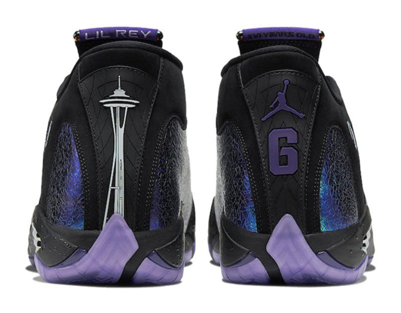 This Air Jordan 14 was designed by Ethan Ellis, a patient at OHSU Doernbecher Children’s Hospital, as part of the annual Freestyle Collection. The design features a black nubuck upper contrasted with Court Purple panels that have a reptilian texture, paying tribute to his favorite team, the TCU Horned Frogs. Personal details include the number '6' on the right heel, representing his heart surgeries, and a depiction of the Seattle Space Needle on the left heel, referencing a care center he visited. The laces feature the names of hospitals that provided his care, and the translucent outsole is adorned with a heart rhythm pattern.