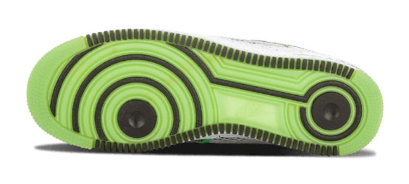 This Air Force 1 is part of the annual Doernbecher Freestyle Collection, where shoes are designed by patients of the OHSU Doernbecher Children's Hospital. The shoe, designed by 11-year-old Finnigan Mooney, features a predominantly black colorway with a distinct "Inside Out" or I/O construction, where the stitching and panels often seen on the interior are exposed on the outside. It includes Metallic Silver accents, a bright Poison Green lining and outsole, and personalized details reflecting Finnigan's story.