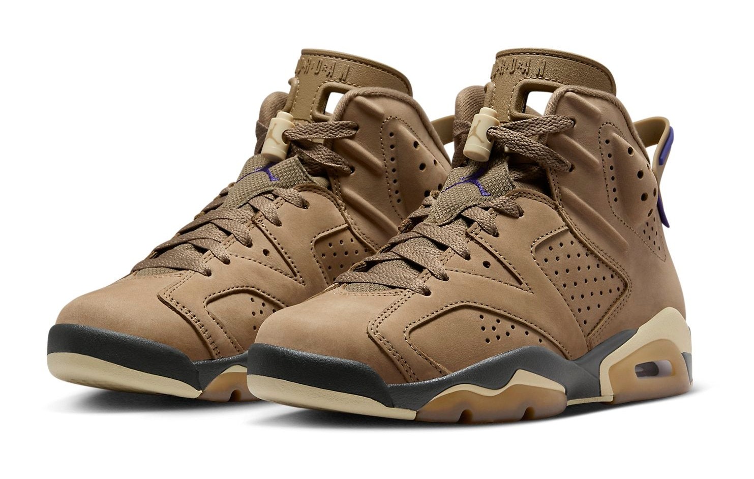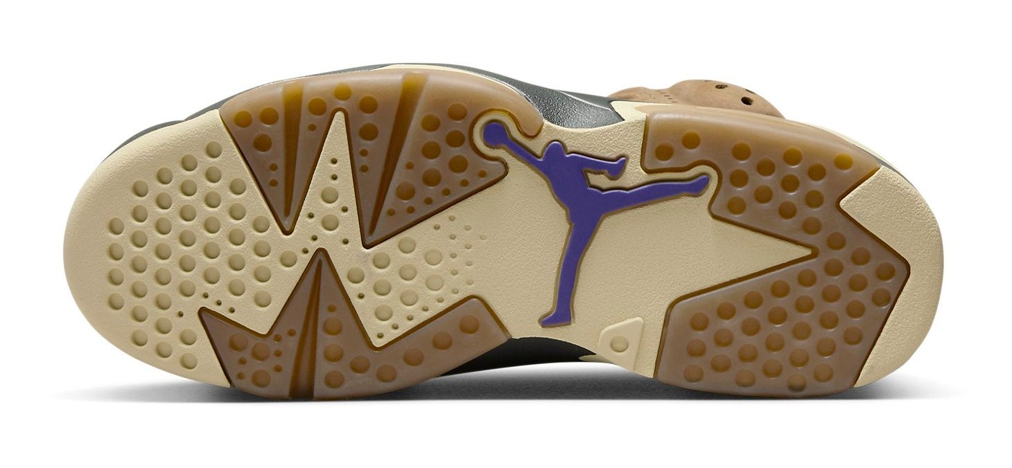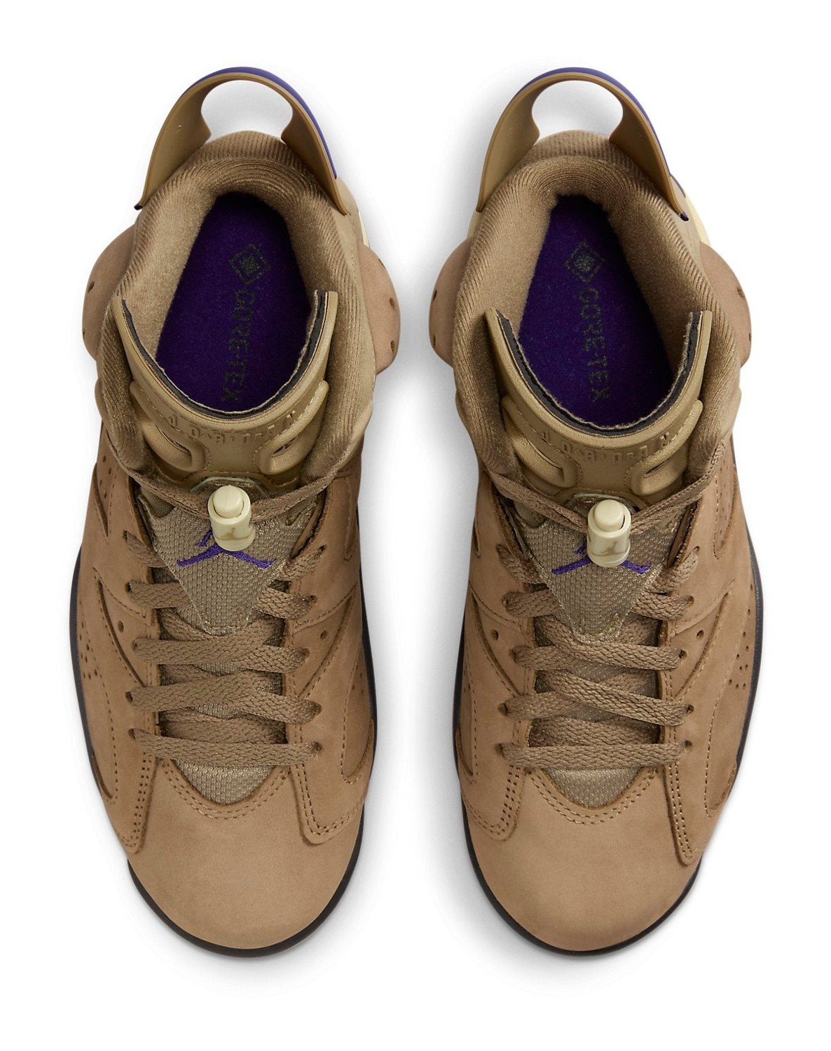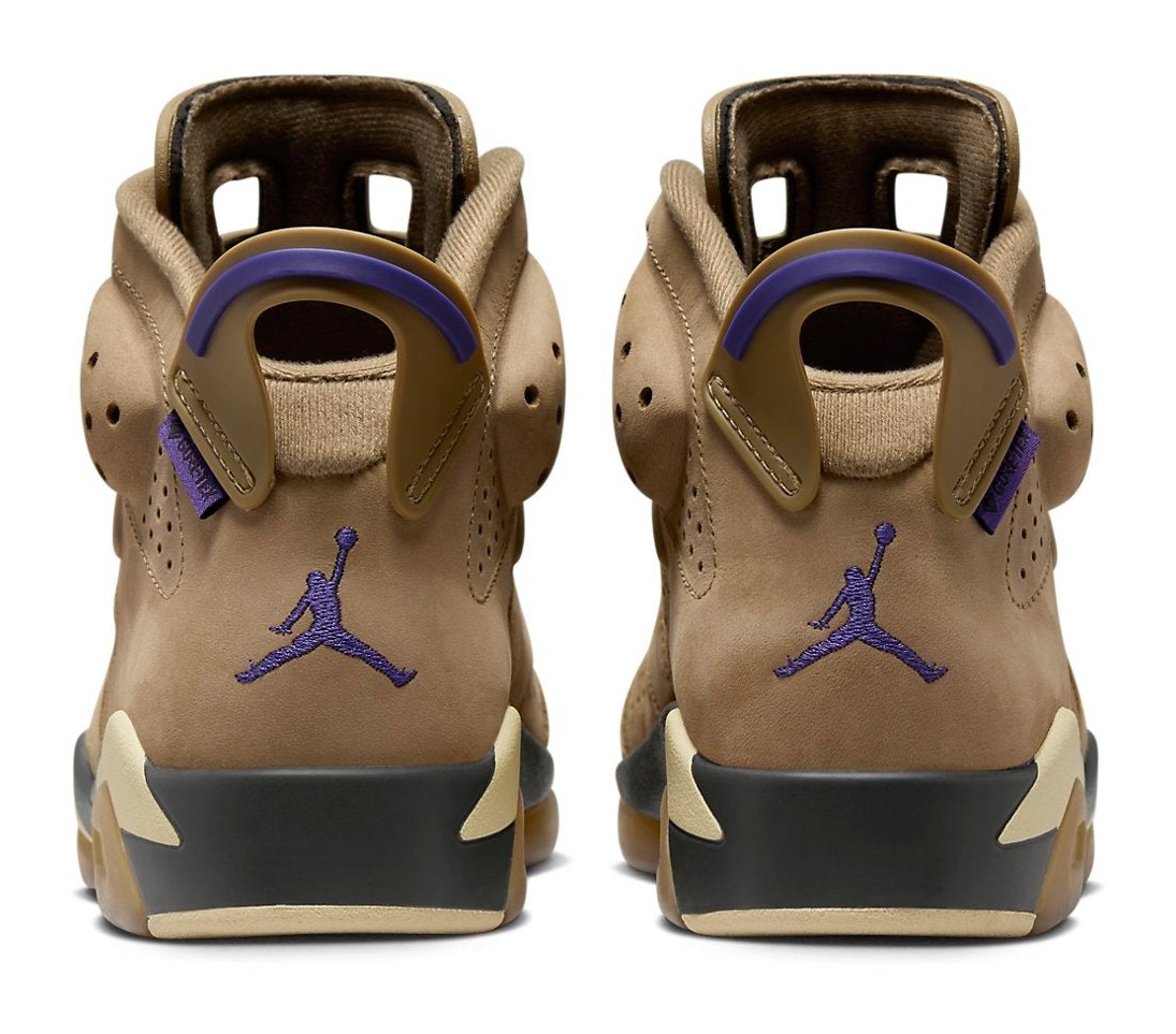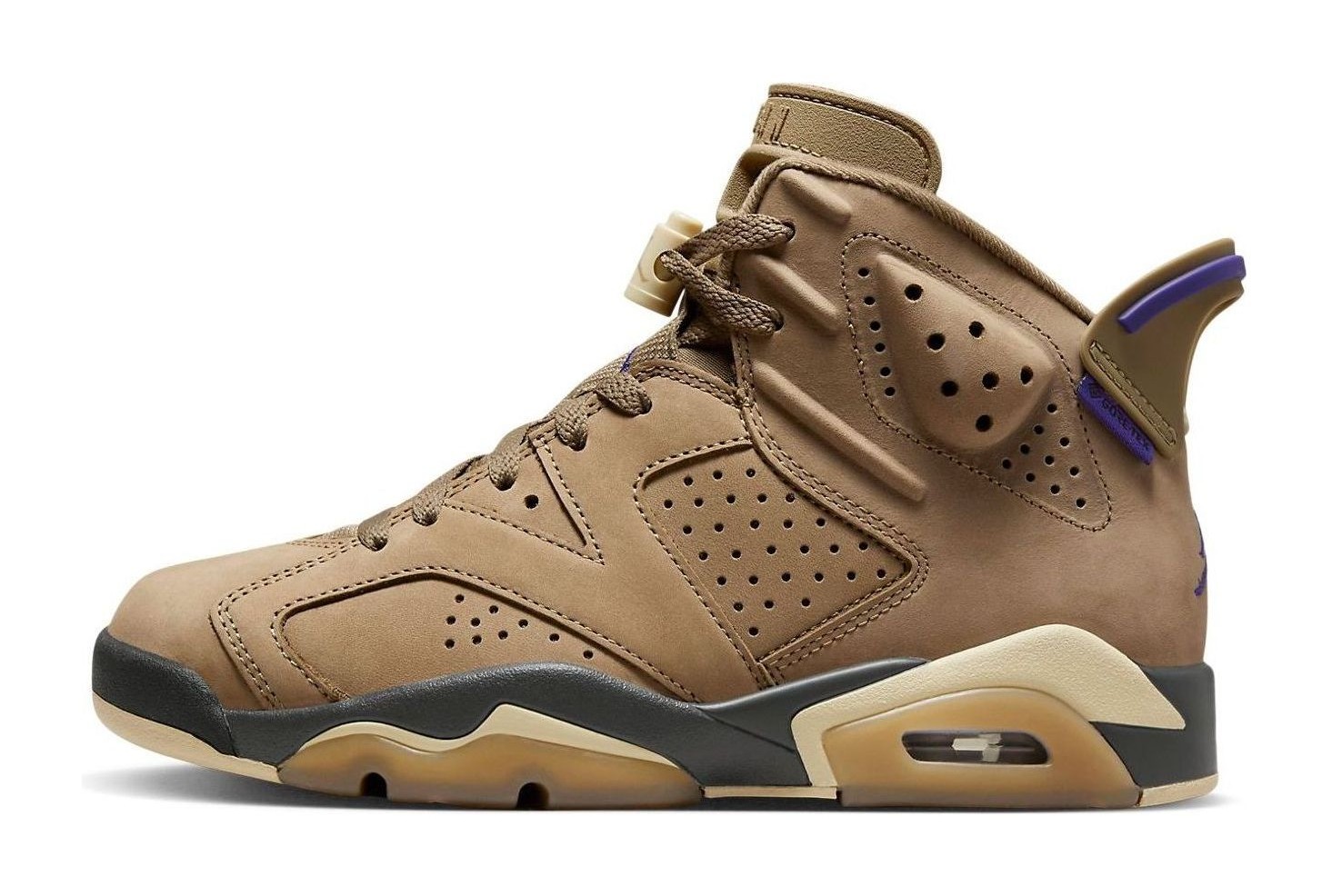 The Air Jordan 6 Retro GORE-TEX "Brown Kelp" is a women's-exclusive, weather-ready version of the classic Air Jordan 6 silhouette. The upper is constructed with a "Brown Kelp" nubuck and features a complete GORE-TEX waterproof lining, making it ideal for wet weather. Contrasting accents of "Court Purple" are used on the heel pull tab, the GORE-TEX tag on the lateral heel, and the Jumpman logos on the tongue and heel, providing a vibrant pop of color against the earthy brown. The midsole is black and yellow, sitting atop a cream-colored outsole with gum rubber hits.