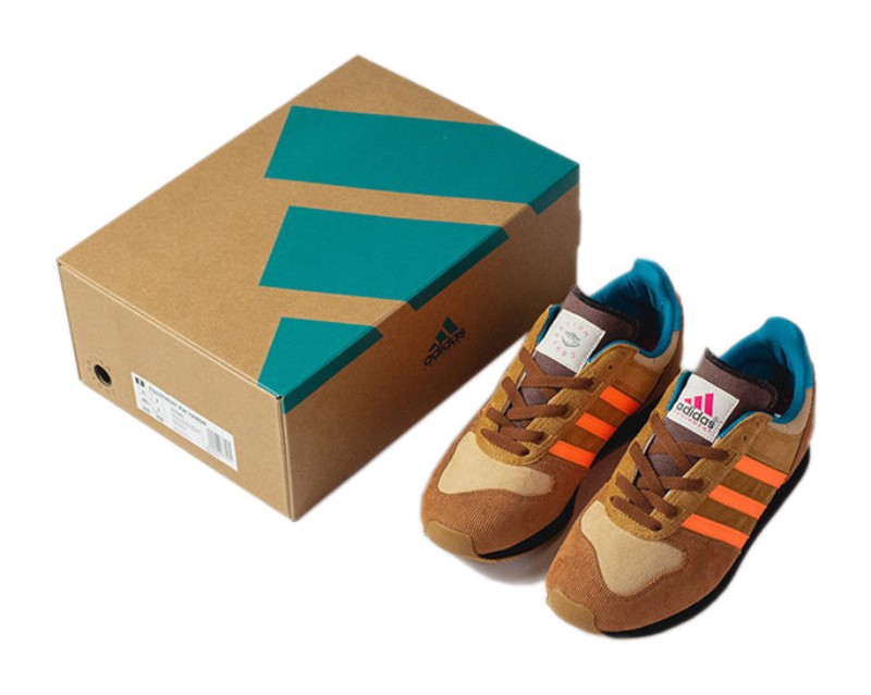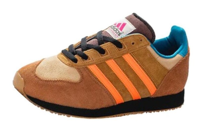 This collaboration takes inspiration from the interior décor of traditional British "Working Men's Clubs." The upper is constructed with a mix of rich materials, primarily featuring Mesa (a dusty light brown) suede and textured Brown corduroy on the overlays, reflecting the vintage aesthetic of a club's upholstery. Bright, serrated Orange three-stripes on the side contrast the earthy tones. The collar lining is a dark blue knit fabric. Key features include mismatched Hanon and Adidas logos embroidered on the heel tabs, co-branded "pub carpet-inspired" insoles, and a solid black die-cut EVA midsole finished with a Gum rubber outsole.