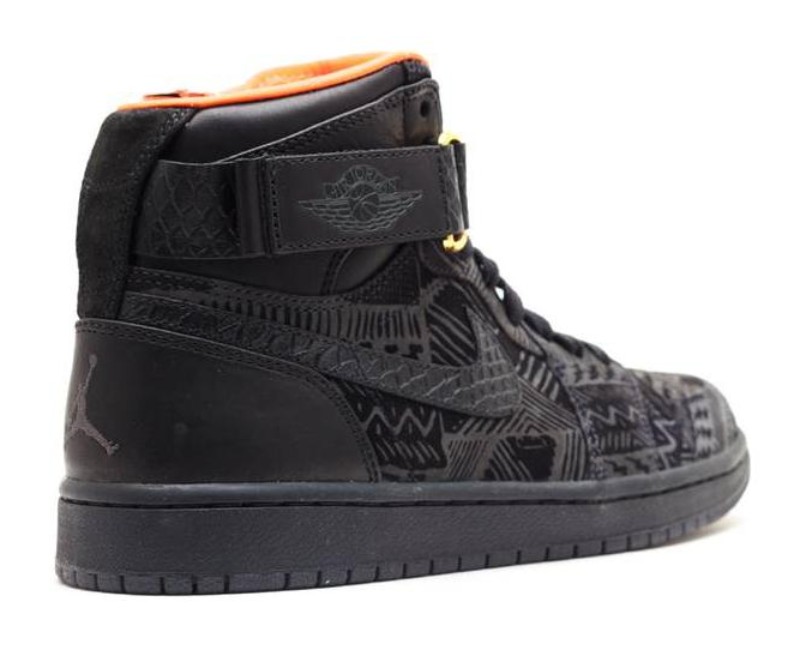 This highly exclusive sneaker was a charitable release for Black History Month (BHM) 2013, designed in collaboration with streetwear designer Don C (Just Don). The shoe utilizes the Air Jordan 1 High Strap silhouette. The upper is made of Black leather, which is accented with various tonal textile prints and panels, signifying the BHM theme. A luxurious touch is added with embossed snakeskin detailing on both the ankle strap and the cut-out Swoosh logo. The all-black exterior is contrasted by a vibrant Orange leather inner lining for a pop of color, and the interior of the tongue features embroidered "BHM" lettering. The model features a removable ankle strap and an Air-Sole unit for cushioning.