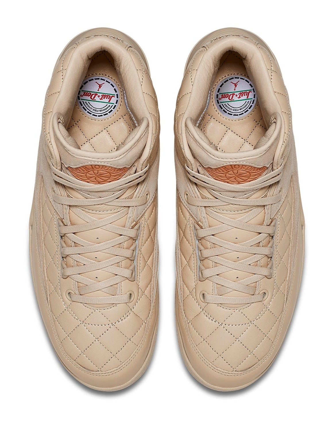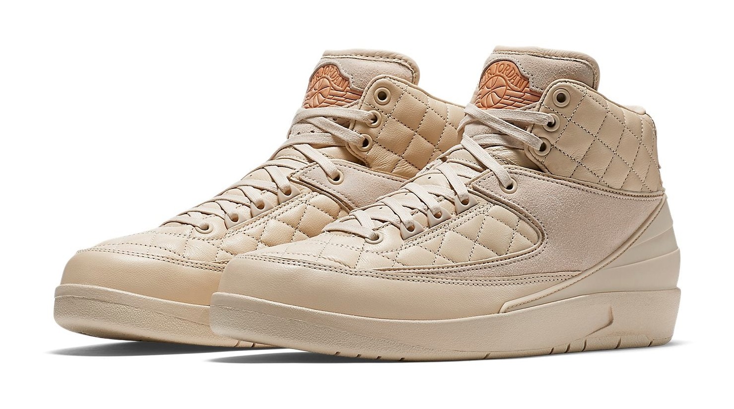 The third colorway in the coveted Just Don x Air Jordan 2 series (after "Royal Blue" and "Beach"), this model is presented in a luxurious, monochromatic "Beach" color, a soft, pale tan/cream hue. The shoe features premium quilted leather paneling on the collar and midfoot, with tonal suede accents, offering a high-end, lifestyle feel. Metallic Gold details are used for the lace tips and the shoe's branding elements, including the Air Jordan Wings logo on the tongue, while a minor touch of University Red is often found on the insole branding. This release was famously packaged with a matching Just Don x Jordan hat.
