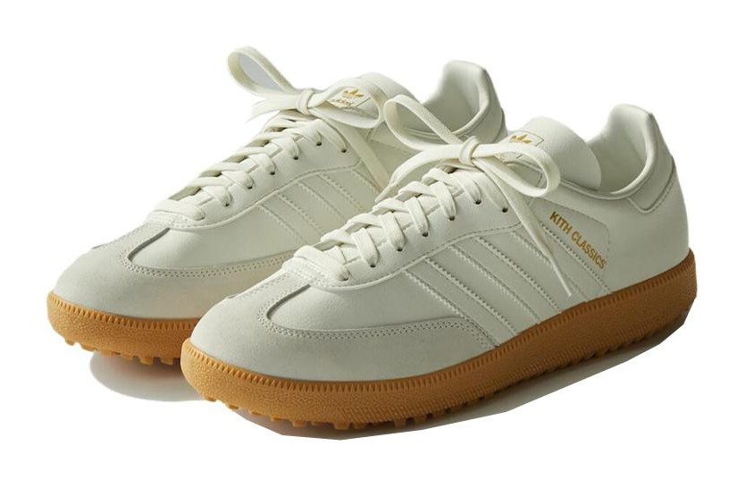 A men's and unisex sneaker resulting from a collaboration between Kith and Adidas. It features a Tint White upper and a distinctive Gum outsole. The shoe combines classic Samba styling with golf-specific features.