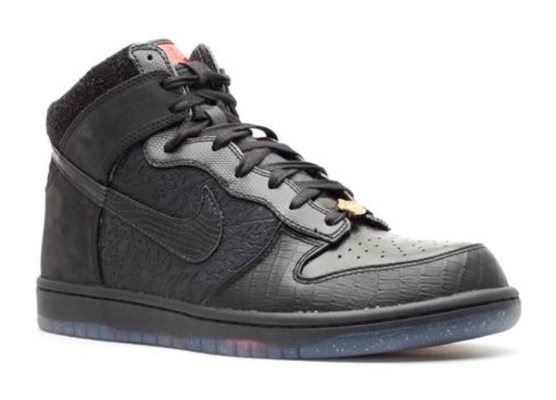 The Nike Dunk High Premium QS 'Mighty Crown 20th Anniversary' is a tribute to the Japanese reggae group Mighty Crown and their 20th year in music. The sneaker is a blacked-out design that utilizes an extremely intricate and varied set of materials to represent the group's powerful sound system and persona:
