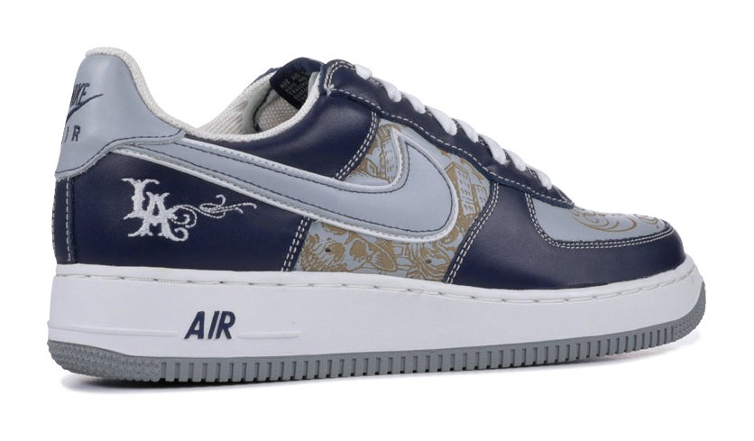 This sneaker is part of a highly sought-after collaboration with legendary Los Angeles tattoo artist Mister Cartoon. The design features Midnight Navy leather overlays and a smooth Silver leather underlay. The most distinctive feature is the intricate, laser-etched "tattoo" artwork, characteristic of Mr. Cartoon's cholo-style drawings, covering the silver toe box and quarter panels. A stylized "LA" script logo is embroidered on the heel, and the shoe is finished with a clean white midsole and a grey outsole.