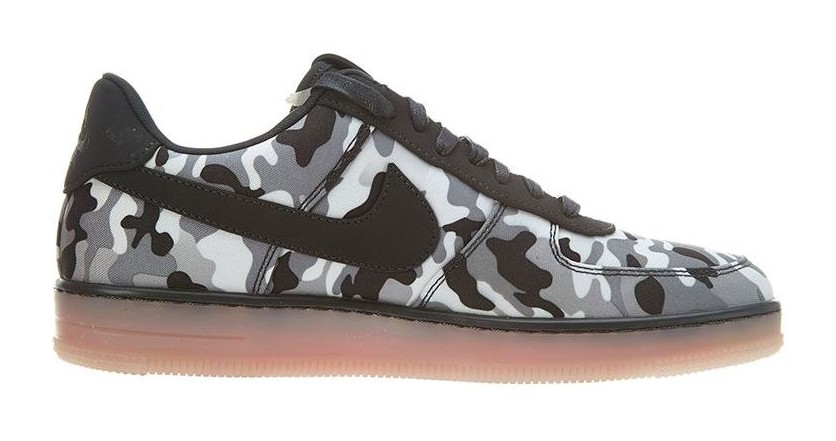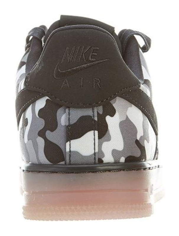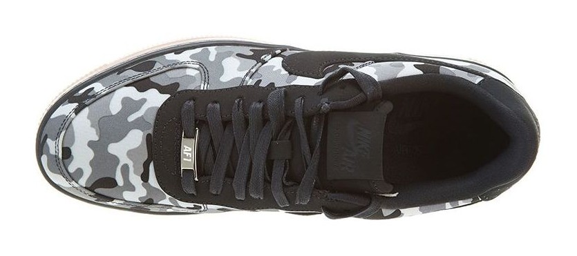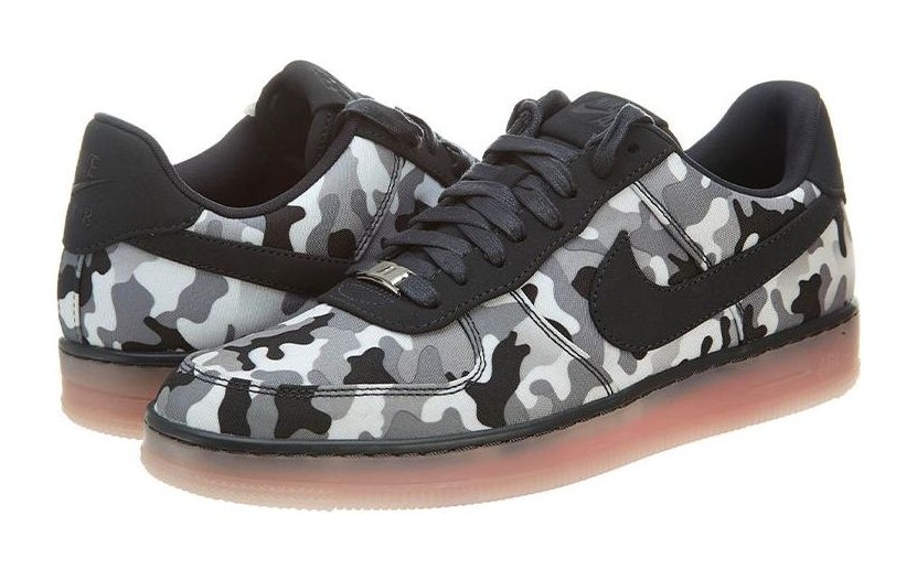 This is a special Quickstrike release featuring the sleeker, lower-profile "Downtown" version of the Air Force 1. The sneaker features a textile (TXT) upper dominated by a distinct "Fighter Jet" camouflage pattern in shades of white, anthracite, and cool grey. The camo graphic and streamlined design give a rugged, military-inspired aesthetic to the classic court shoe.