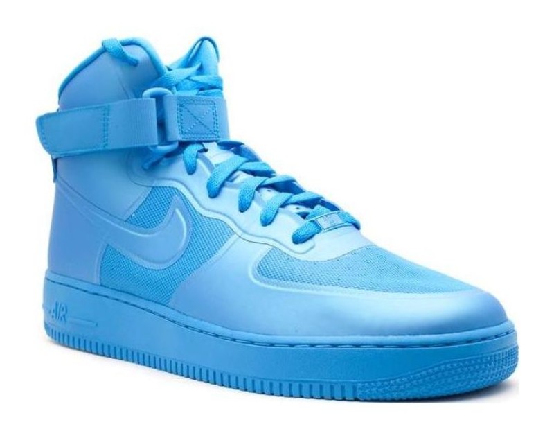 This is a high-top Air Force 1 that utilizes Nike's Hyperfuse construction for a lighter, more modern feel than the traditional leather model. The entire shoe features a monochromatic Blue Glow colorway, a vibrant shade of blue that covers the seamless upper, ankle strap, midsole, and outsole. The Hyperfuse technology provides a sleek, seamless synthetic upper with enhanced breathability and durability, giving a futuristic twist to the classic basketball silhouette.