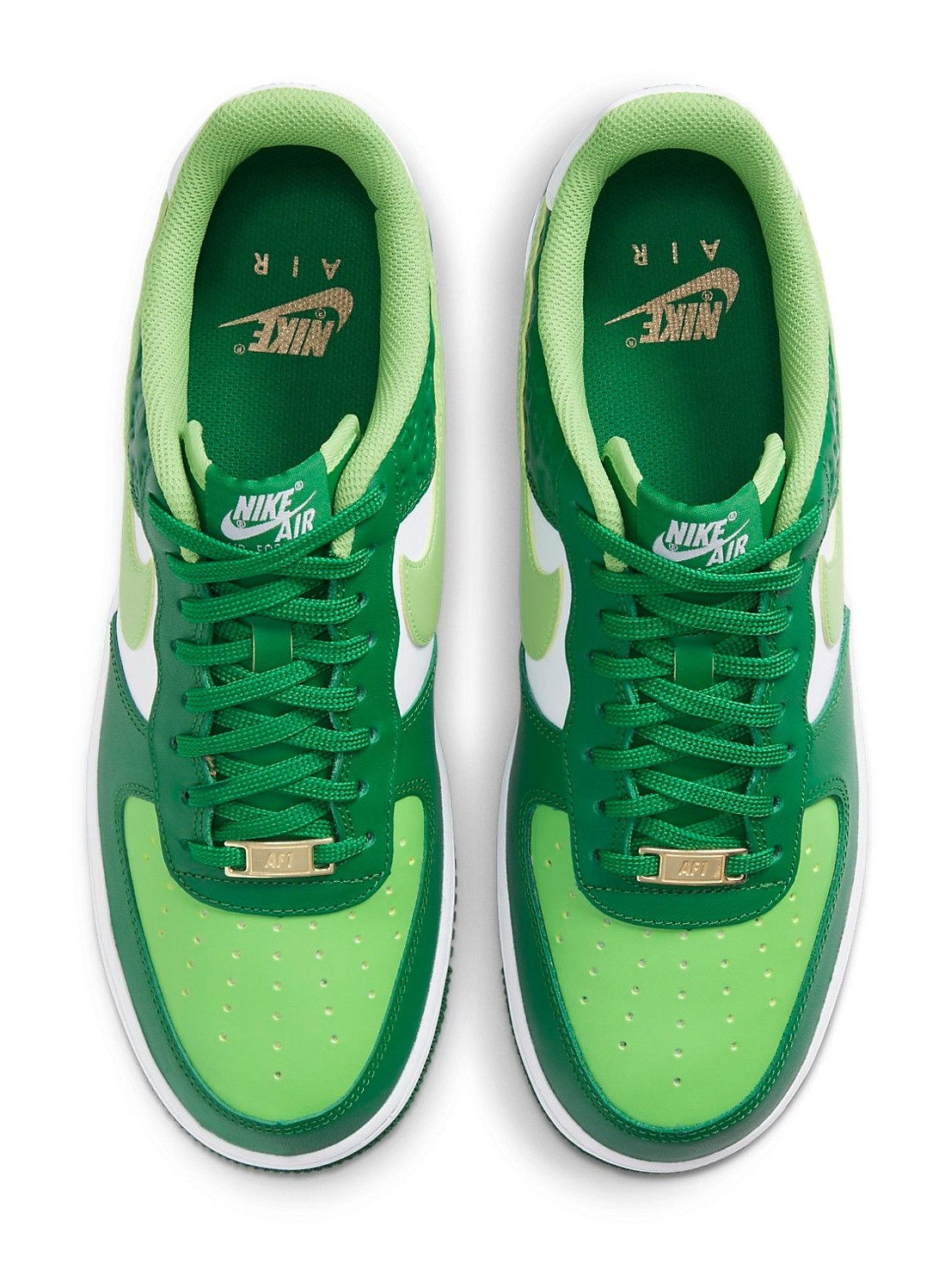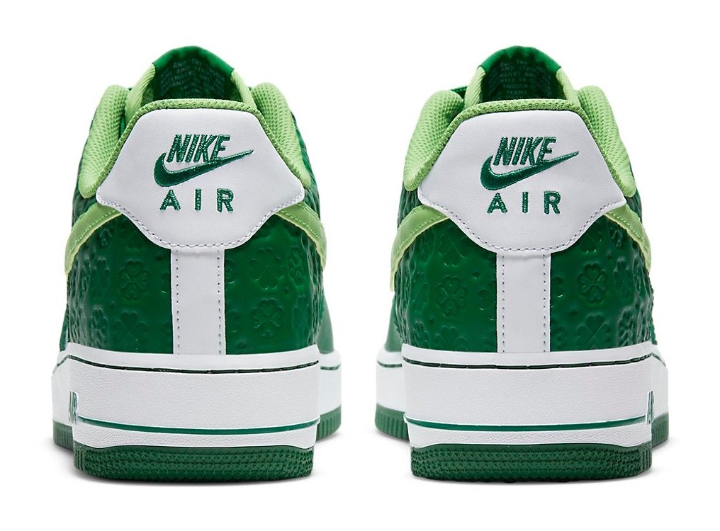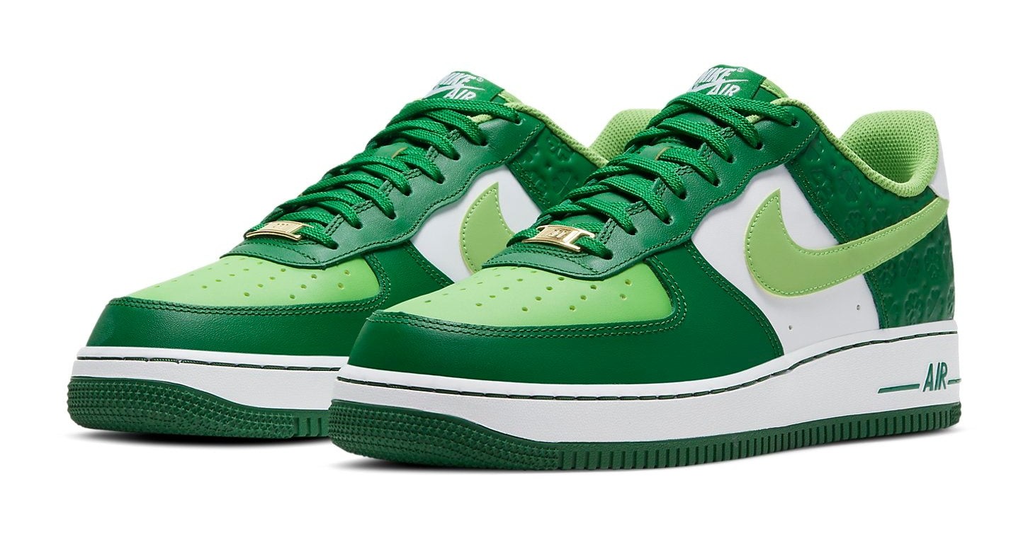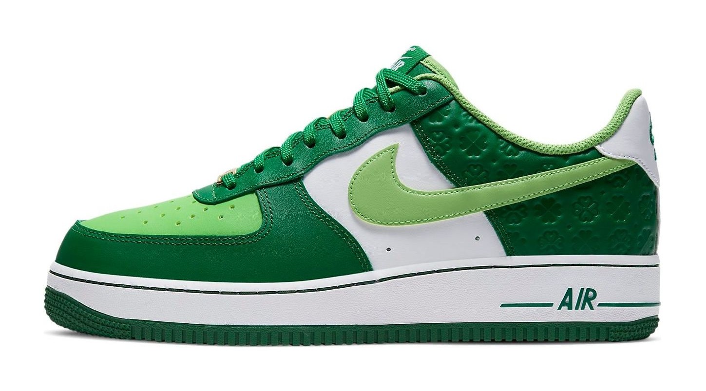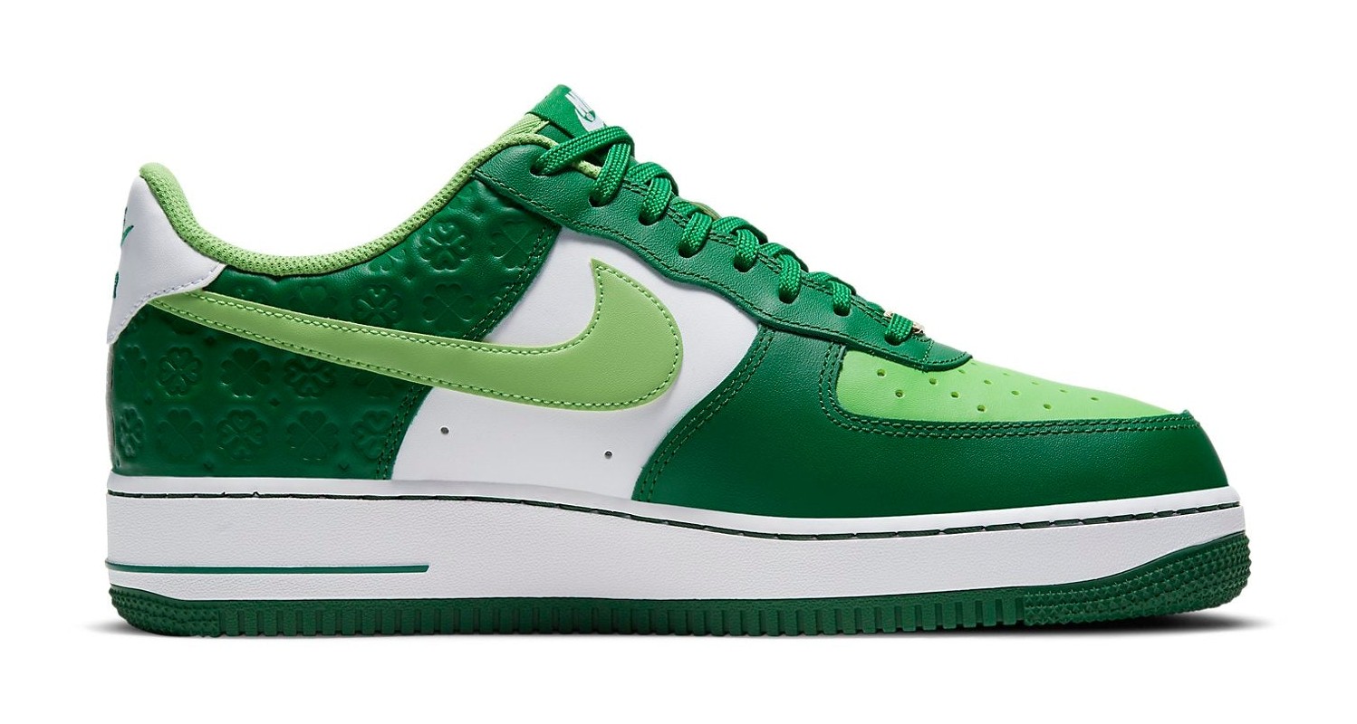 This sneaker celebrates St. Patrick's Day with a festive green and white color scheme. The leather upper uses two shades of green, Pine Green on the overlays and Mean Green on the perforated toe box and Swoosh. A key feature is the repeated four-leaf clover debossed pattern on the heel overlay. The design is finished with a white midsole, green outsole, and a gold-toned lace dubrae.