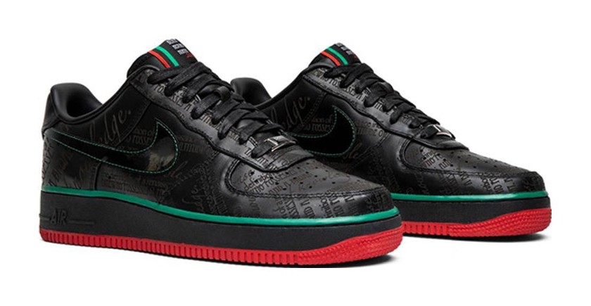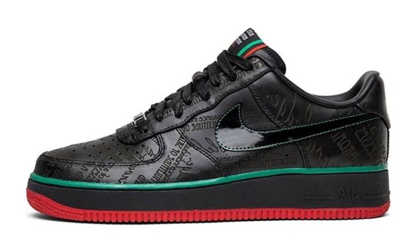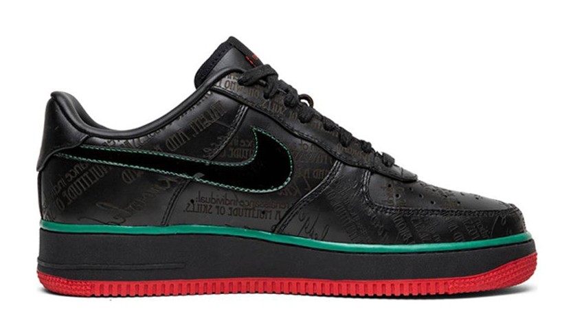 This sneaker, part of the 2010 Black History Month collection, features a black leather upper with a black patent leather Swoosh. Its most distinct feature is the engraved text across the upper panels, which reads: "The definition of a renaissance individual: one who possesses a multitude of skills, talent and a broad base of knowledge." The shoe also incorporates a black midsole with a green accent stripe (foxing stripe) and a Varsity Red rubber outsole, adding color elements to the otherwise monochromatic black design.