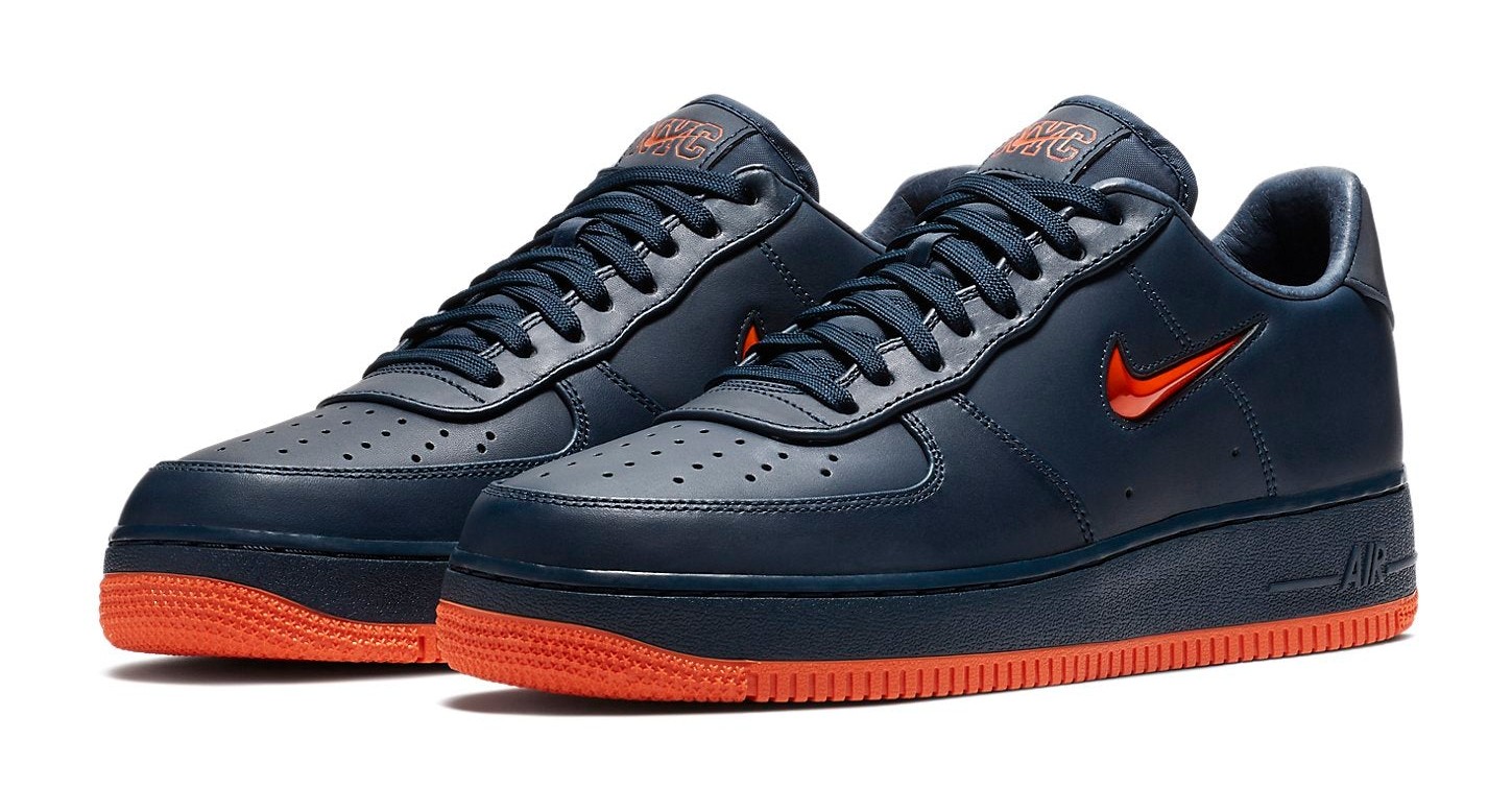 This model, released as a Quickstrike, features a premium construction in an "Obsidian" (dark blue) and "Brilliant Orange" colorway, drawing inspiration from New York City's public safety workers. The upper is dressed in Obsidian, contrasted by the vibrant Brilliant Orange detailing. The shoe features classic Air Force 1 Low styling with elevated materials and is part of a series that pays homage to different New York themes.