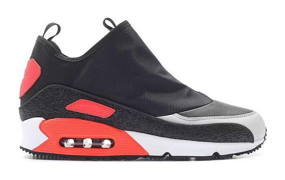 This winterized version of the Air Max 90 is designed for cold and wet conditions. The shoe features a Black and Cool Grey upper with a water-resistant synthetic shell that zips up over the tongue and laces for protection against the elements. The black leather mudguard and subtle red accents, reminiscent of the classic 'Infrared' colorway, complete the look. It is built on a durable rubber outsole for enhanced traction and includes the signature Max Air unit in the heel for cushioning.