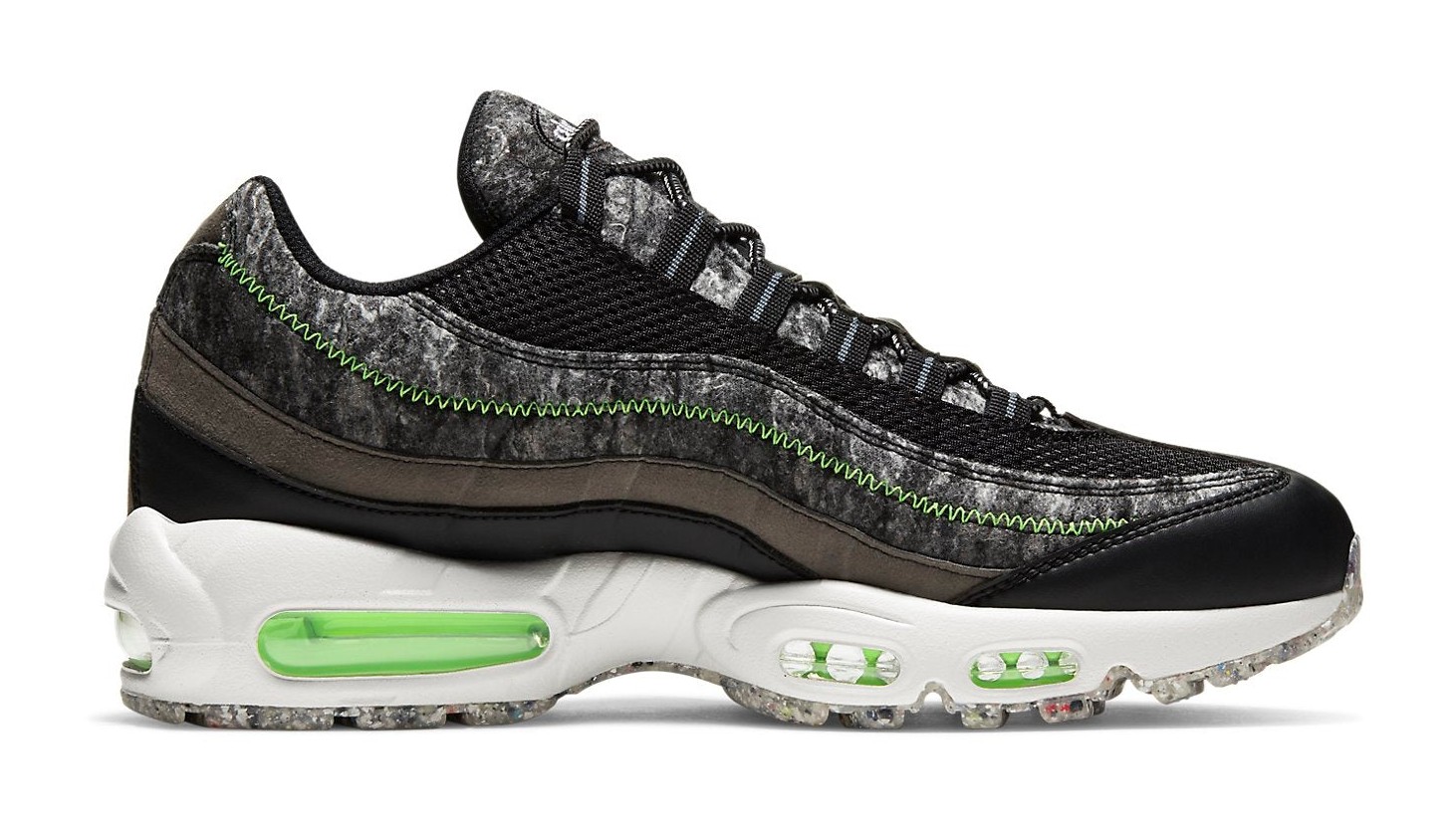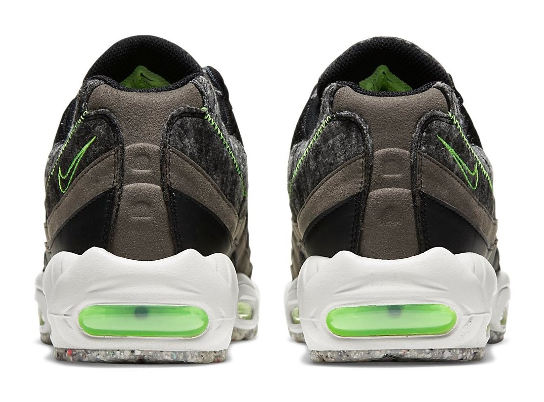 This Air Max 95 features a predominantly black upper, incorporating materials made from recycled content, specifically recycled wool on the side panels and tongue as part of Nike's "Move to Zero" sustainability program. The design is highlighted by vibrant Electric Green accents on the eyelets, the mini-Swoosh on the heel, and the visible Air Max units in both the forefoot and heel. The black midsole and outsole complete the look, providing a dark base for the striking green details.