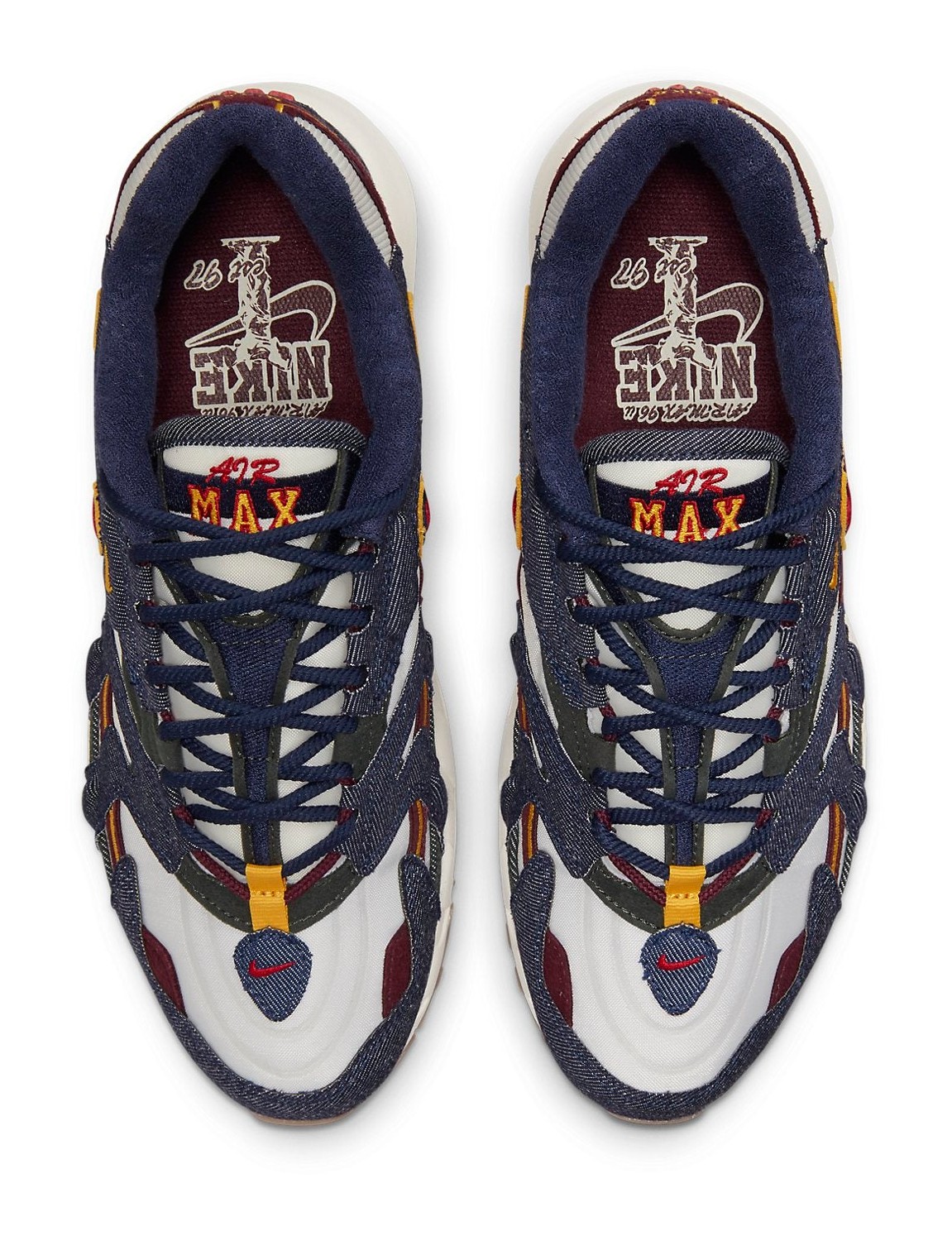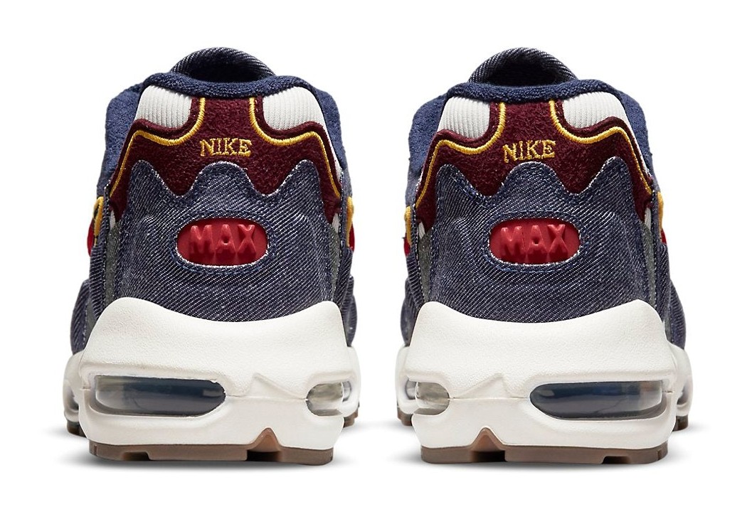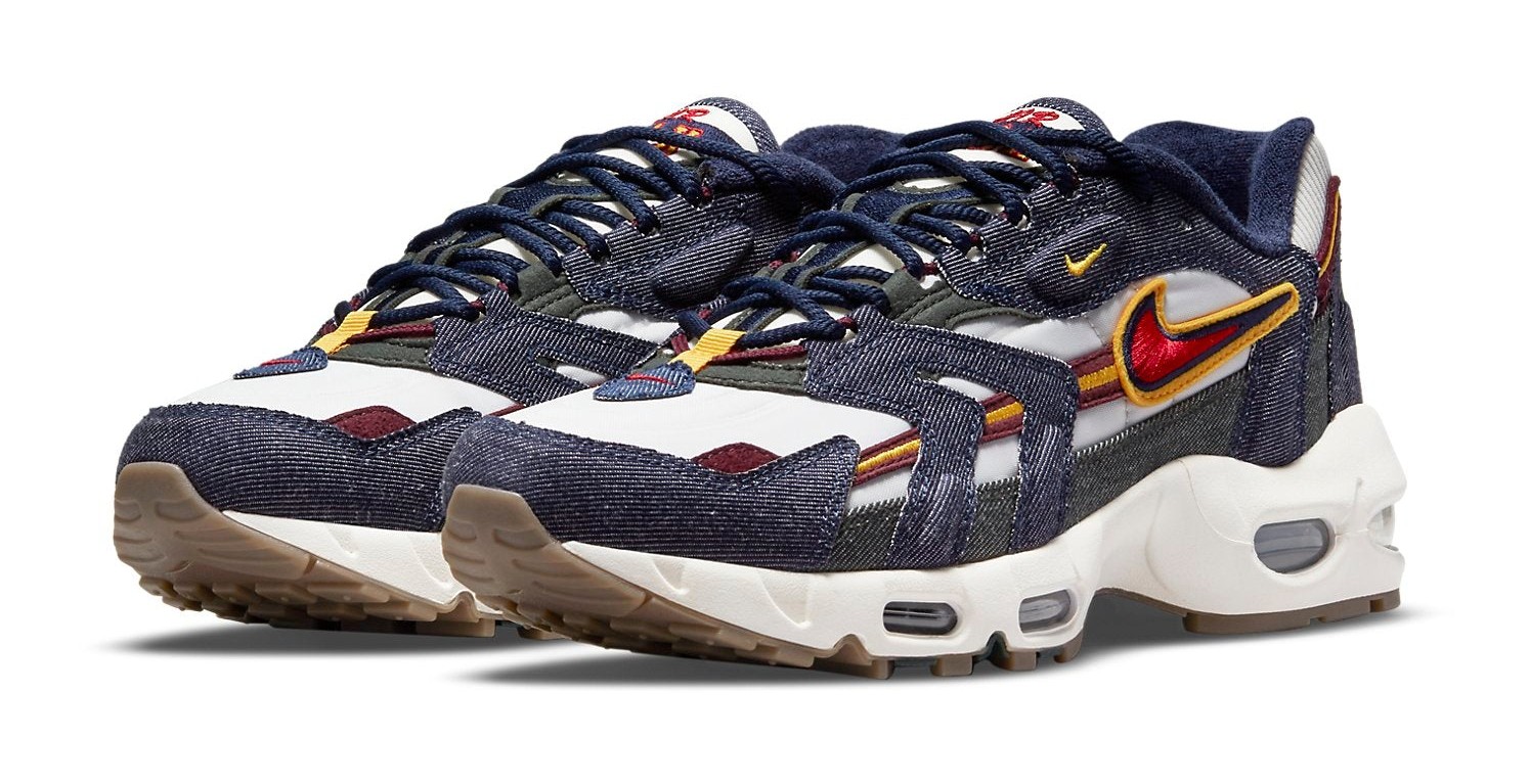 A striking retro release that incorporates unique denim overlays. The upper features a white textile/mesh base contrasted by rugged Blackened Blue (dark navy) denim overlays. Gym Red (bright red) and yellow accents provide a collegiate or patriotic pop of color on the stitching, smaller Swooshes, and the Air Max cushioning units in the forefoot and heel. The overall aesthetic is a rugged and layered take on the classic 90s runner.