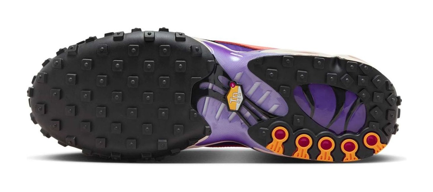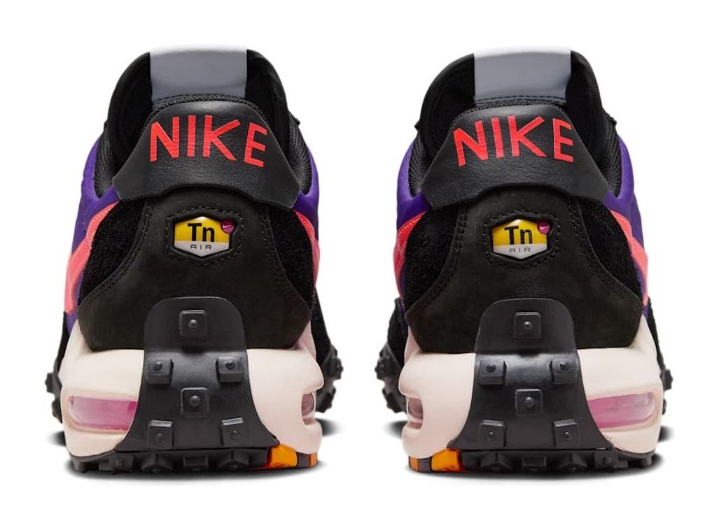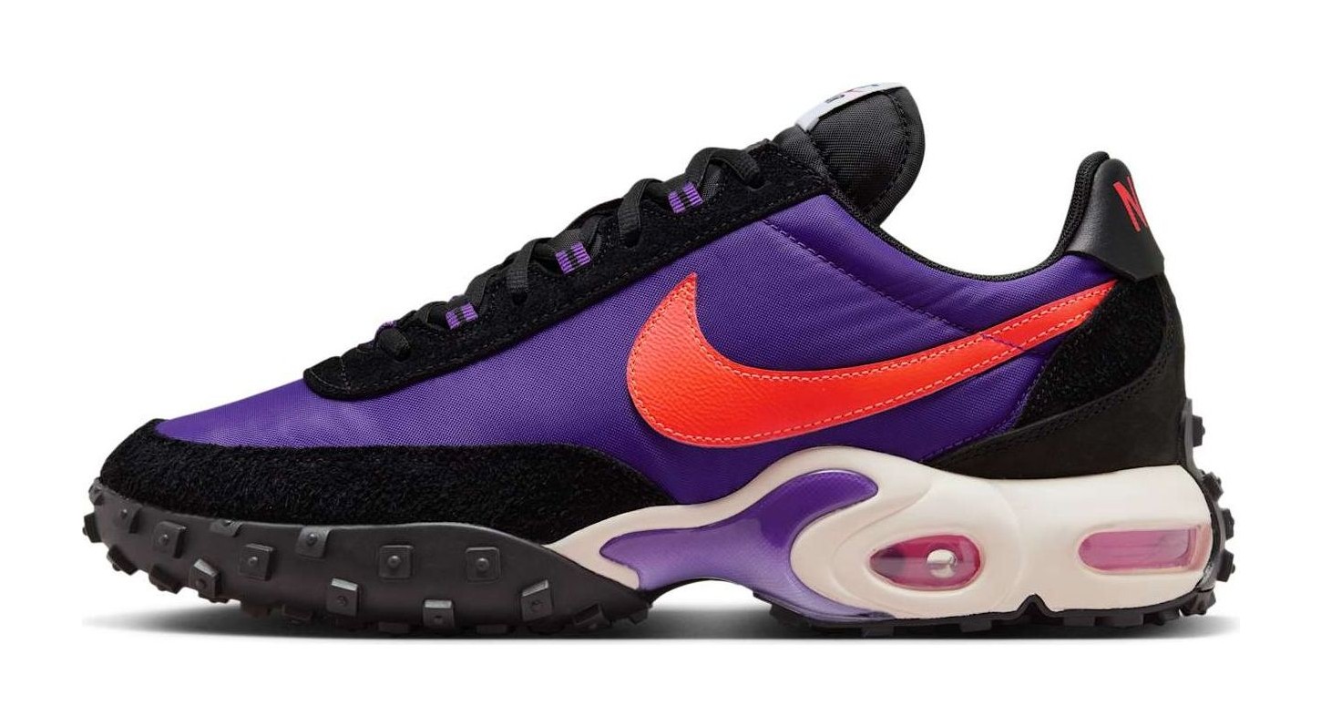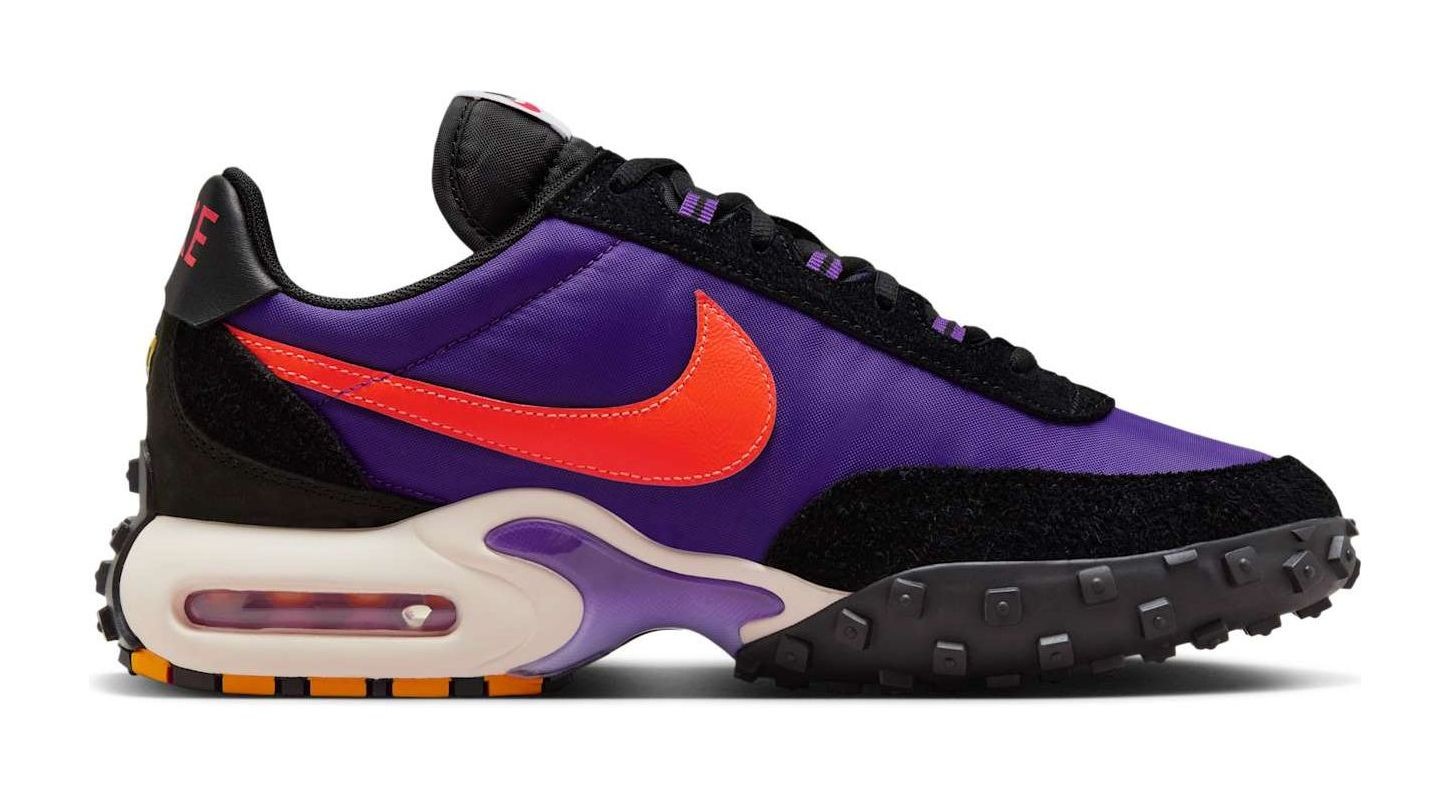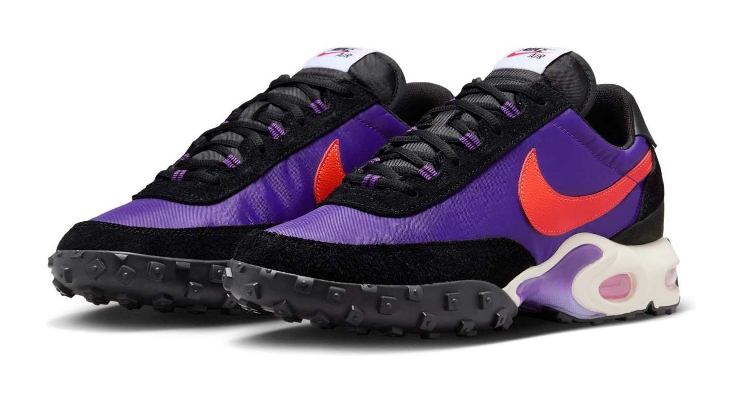 This shoe combines elements from two classic Nike sneakers: the Air Max Plus and the Waffle Racer. The result is a hybrid design featuring a vibrant Voltage Purple nylon and suede upper with a Total Orange Swoosh and other accents. It has a chunky midsole that incorporates the Tuned Air cushioning from the Air Max Plus and the signature waffle-patterned rubber outsole from the Waffle Racer. The shoe also includes a leather back and an aged tongue for a vintage look. The colorful upper and combination of retro and modern features create a unique and audacious aesthetic.
