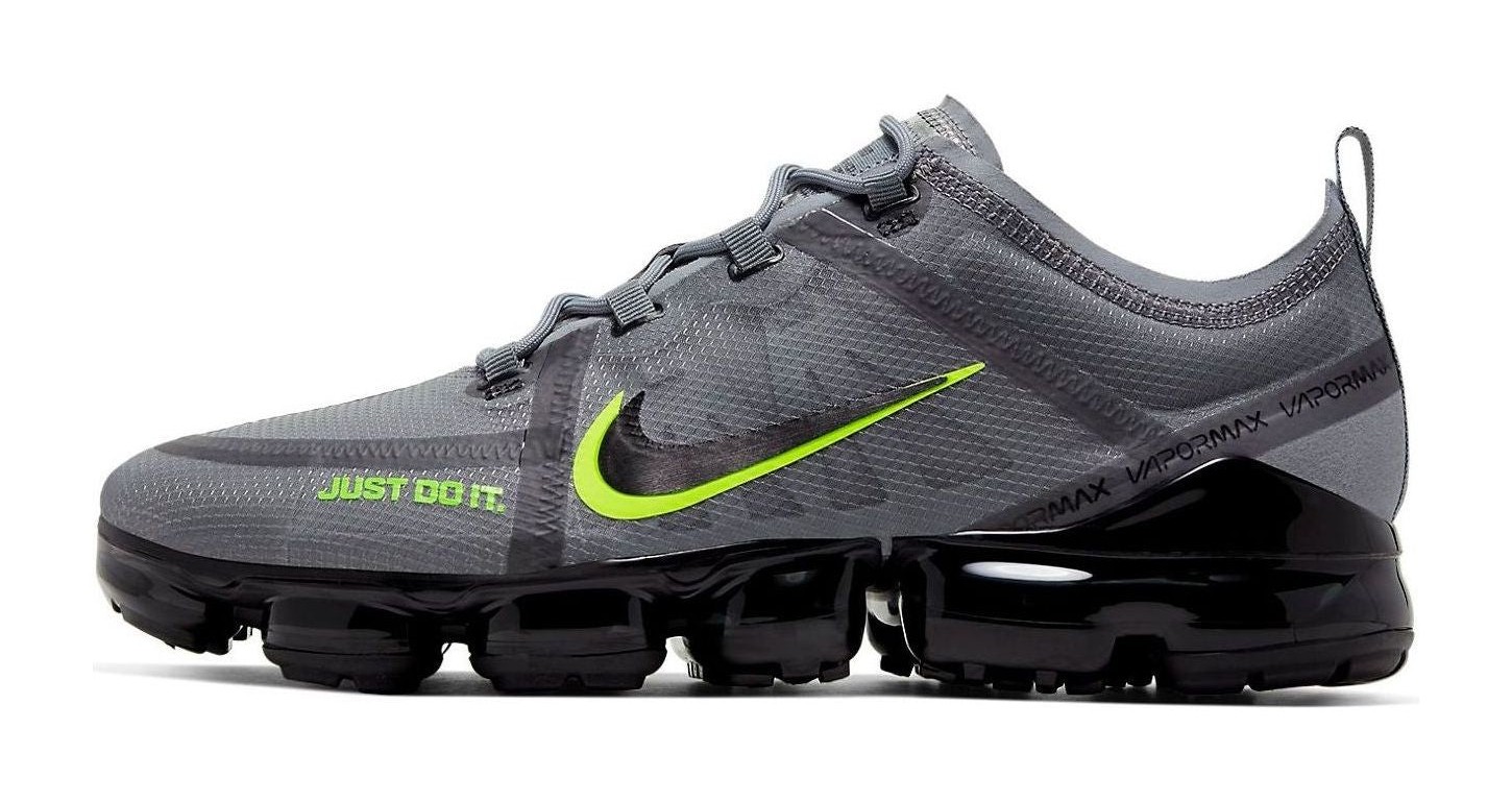 This special "DRT" edition of the VaporMax 2019 features a translucent, stretch-woven upper in a cool grey finish. The design is highlighted by vibrant Volt accents on the laces, Flywire cables, and outsole pods, and includes metallic silver details. A full-length VaporMax Air unit provides responsive cushioning and a signature aesthetic. The shoe also incorporates a black internal cage for a locked-down feel.