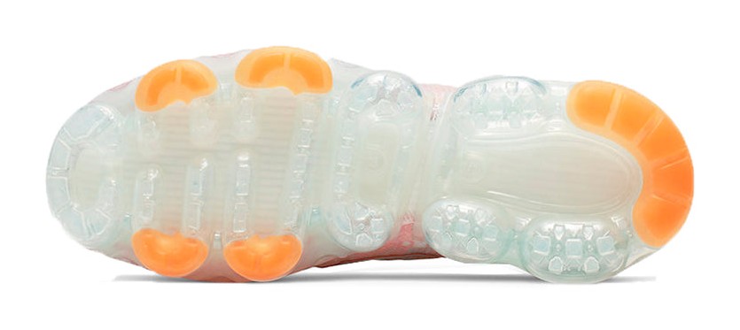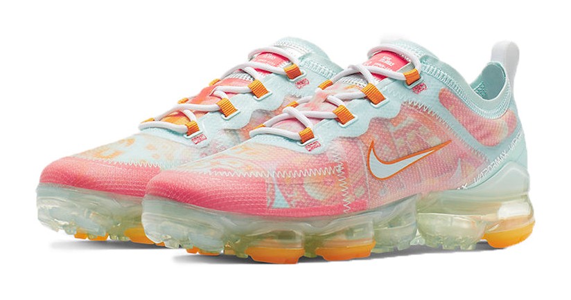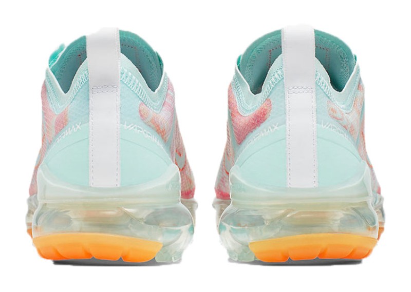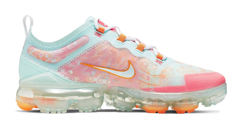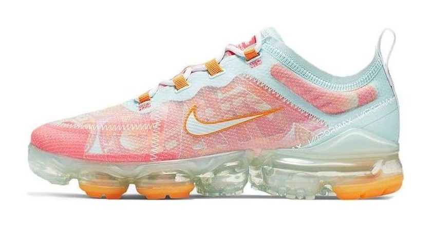 This special "Quickstrike" edition of the women's VaporMax 2019 features a semi-translucent, woven TPE upper in a teal tint color. The design is highlighted by an orange-and-pink motif inspired by the shoe's outsole pattern. The sneaker is constructed with a translucent TPE covering over a lightweight woven upper, adding durability and moisture resistance. A full-length VaporMax Air cushioning unit provides lightweight, responsive cushioning.