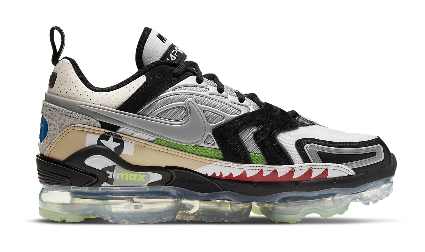 This special edition sneaker packs elements from various iconic Air Max models into one asymmetrical pair. The left shoe is inspired by the Air Max 90 'Warhawk', 'Moon Landing', and OG 'Royal'. The right shoe references the Air Max 98 'Snakeskin', Air Max 1/97 'Wotherspoon', and OG 'Hyper Blue' Air Max Plus. The upper is a mix of synthetics, mesh, and leather, with a black base and multi-colored details throughout. The full-length VaporMax Air unit provides lightweight cushioning.