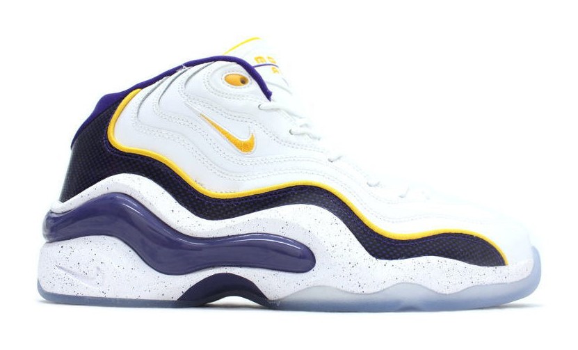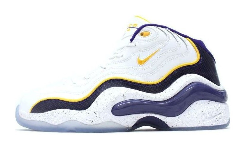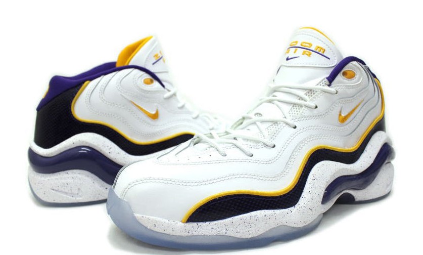 This shoe updates the 1990s basketball classic with a color scheme inspired by the Lakers, the team that drafted Kobe Bryant in 1996. The sneaker is primarily white, featuring University Gold and Court Purple accents. The heel is stitched with the number "8," a nod to Bryant's original jersey number. The Zoom Air technology provides responsive cushioning, while the outsole has a speckled, icy finish.