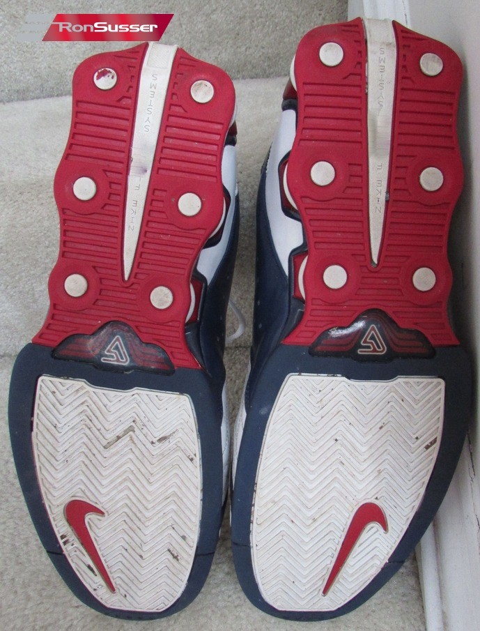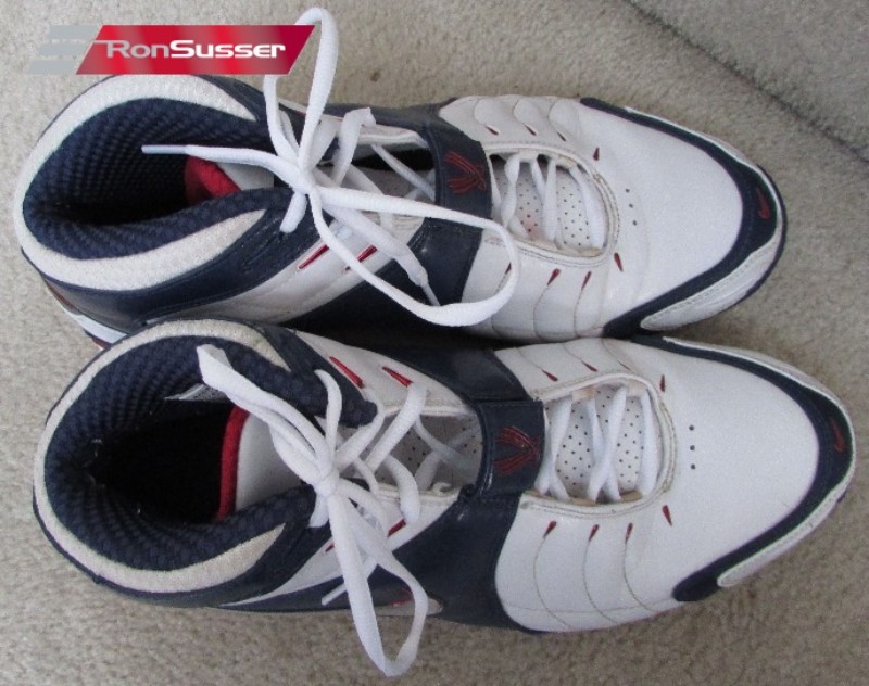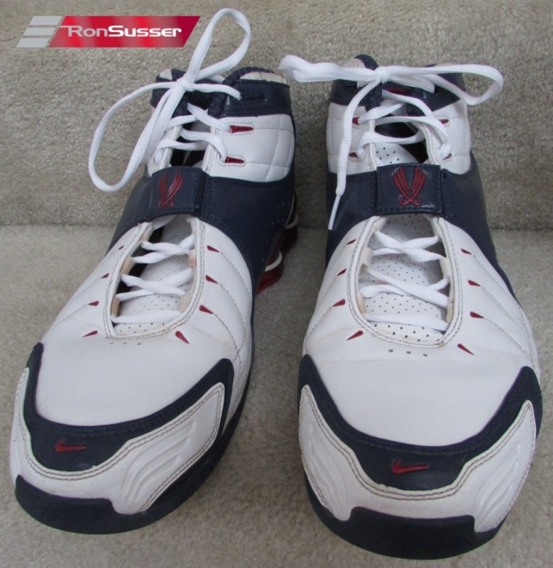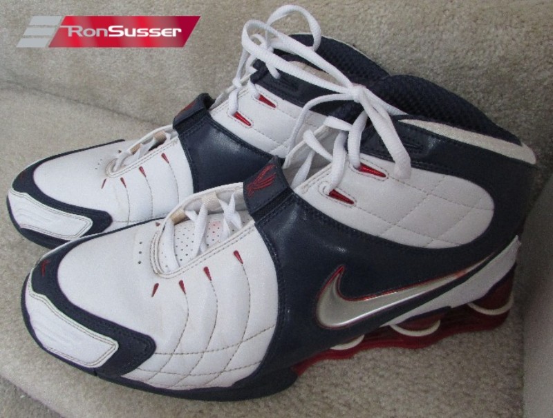 This colorway is inspired by the classic red, white, and blue theme associated with the United States Olympic team, which Vince Carter was a part of in the 2000 Sydney Olympics. The shoe features a predominantly White upper, with patriotic accents of Varsity Red and Midnight Navy detailing the Shox columns in the heel and the straps. It is built with the signature Shox cushioning for explosive energy return and a midfoot strap for lockdown, designed for elite-level basketball performance. The VC suffix stands for Vince Carter.