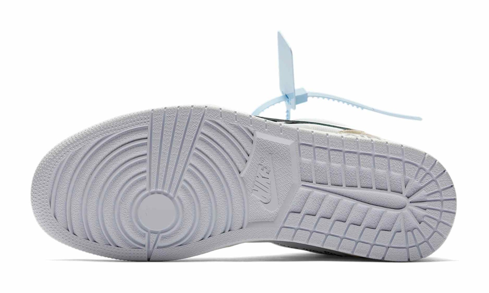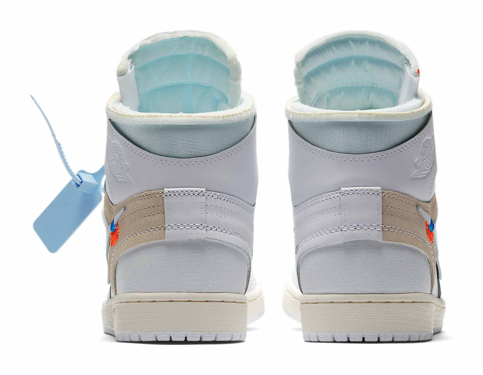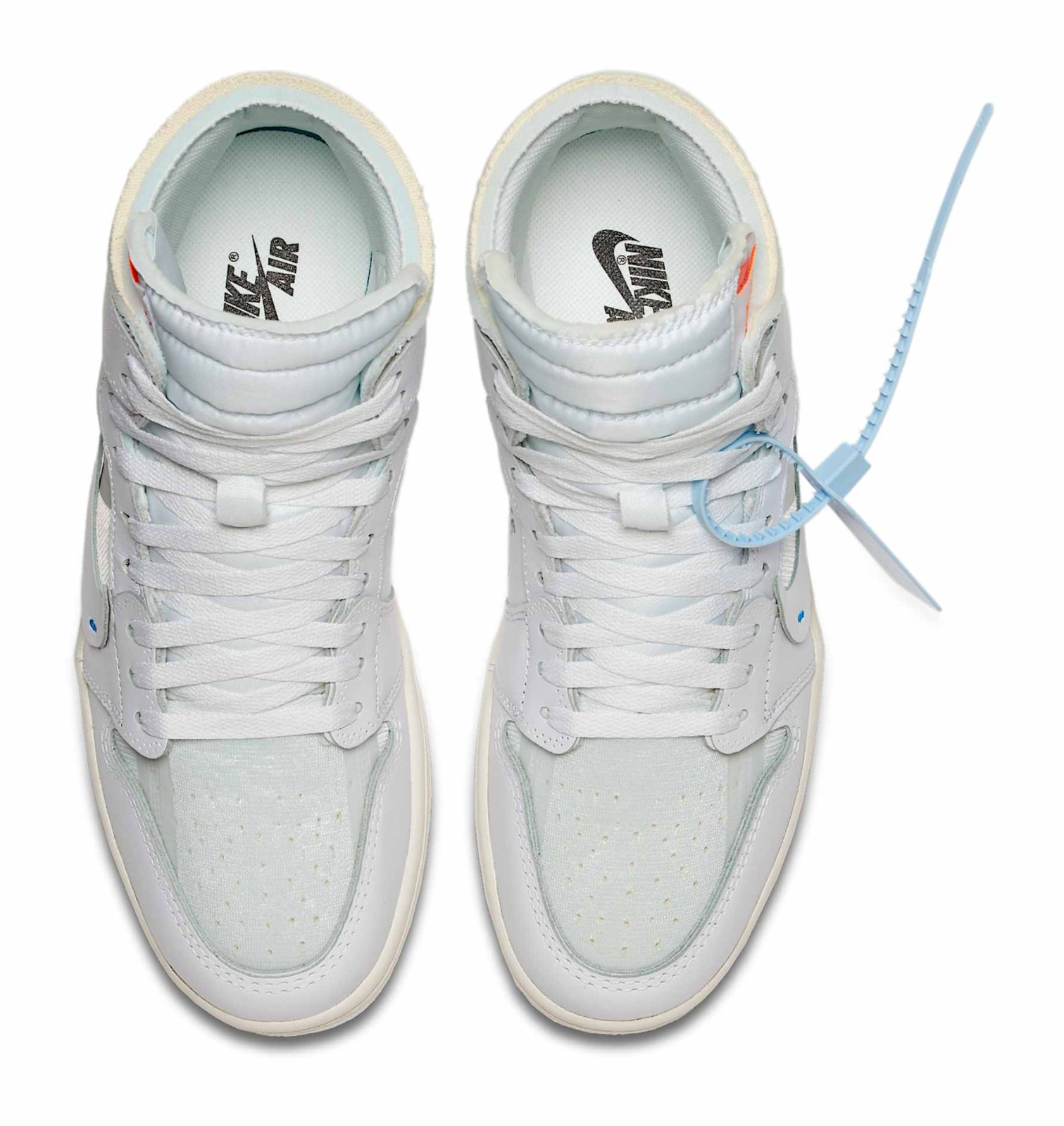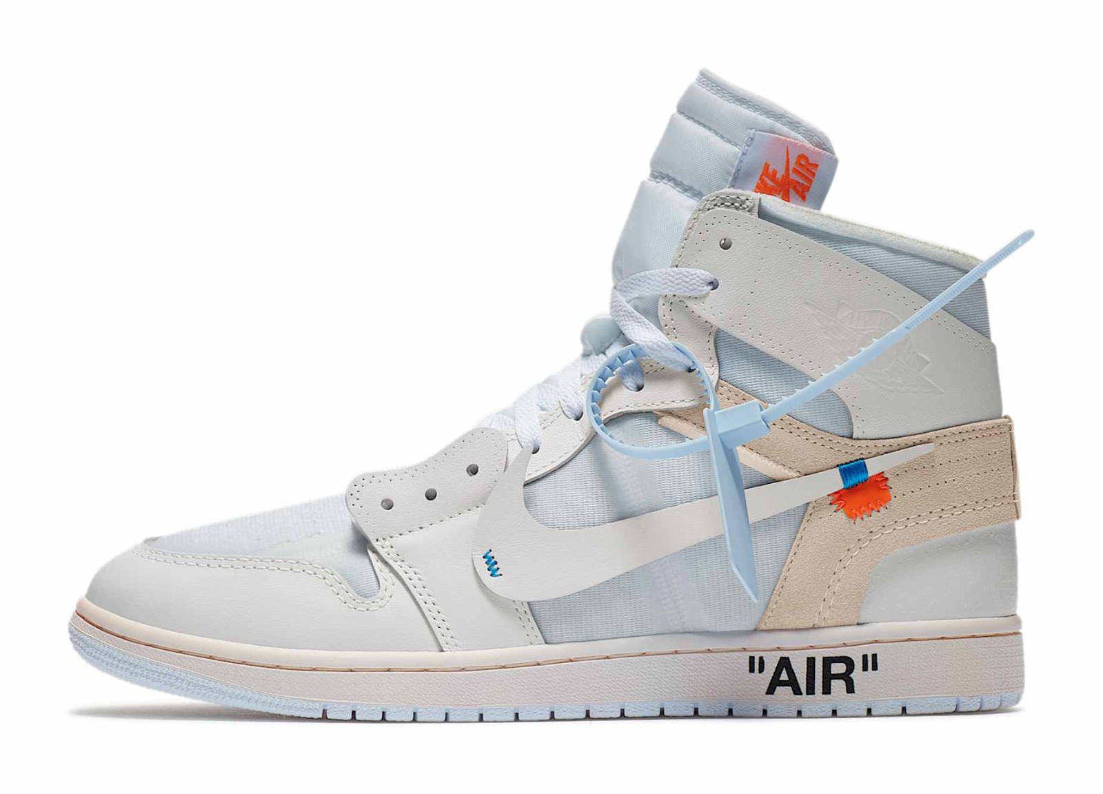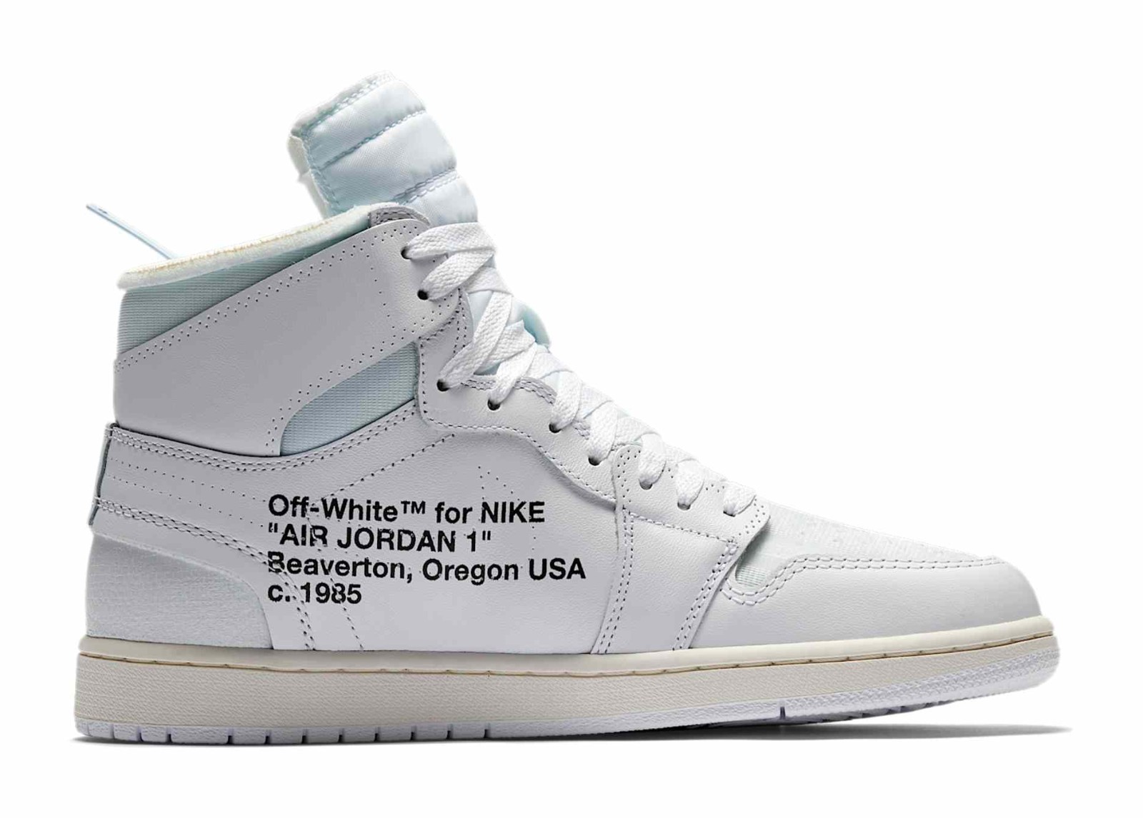 This shoe is the second colorway of the iconic Off-White x Air Jordan 1 collaboration, following the "Chicago" edition, and was initially a Europe-exclusive release. It uses an almost entirely White and Sail color scheme across its deconstructed leather and mesh upper. The shoe is characterized by Virgil Abloh's signature design language, featuring exposed foam edges, misplaced stitching, "AIR" printed on the midsole, a stitched-on Swoosh, and text branding on the medial side that includes the model's name, the brand, and the location/date of Nike's headquarters. It comes with a detachable blue Off-White zip tie and multiple colored laces.