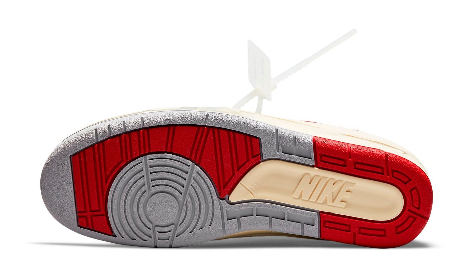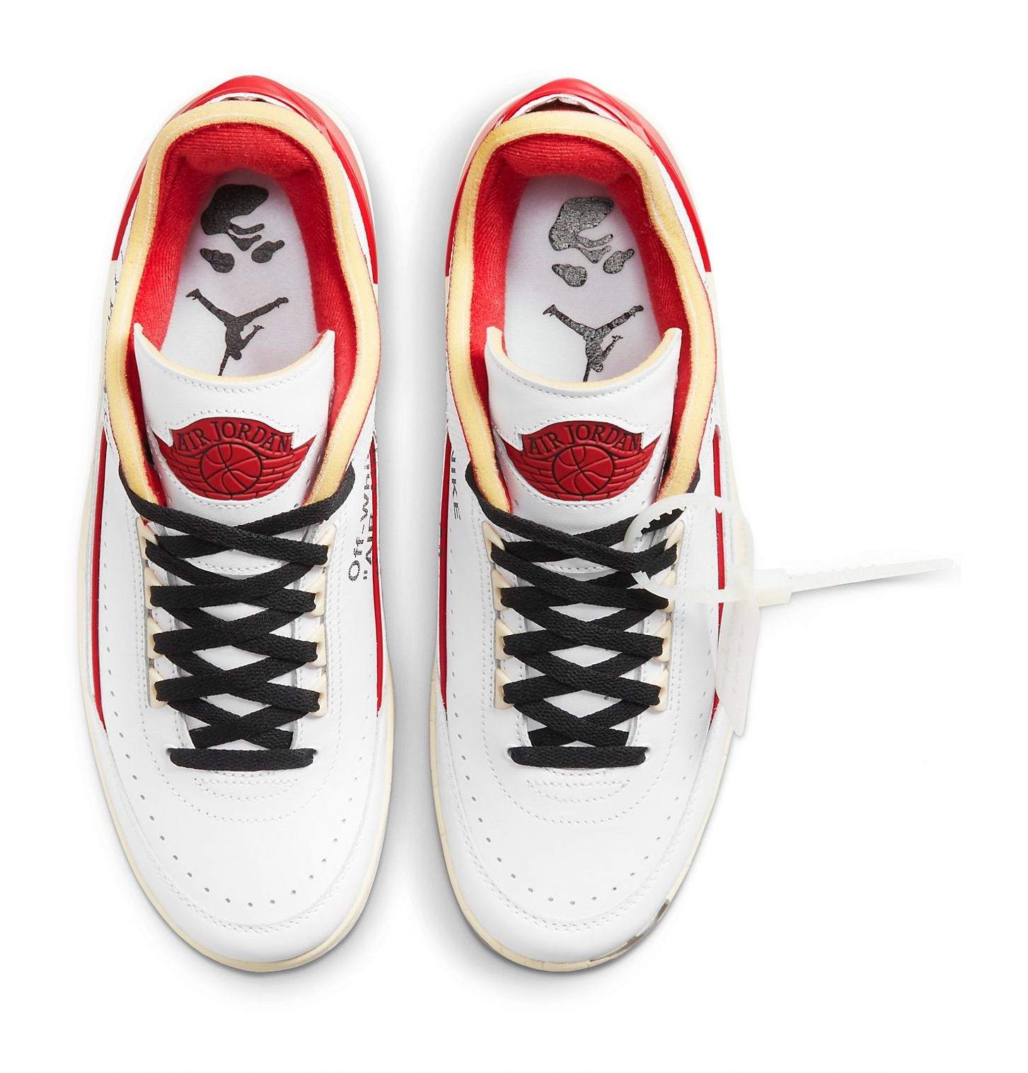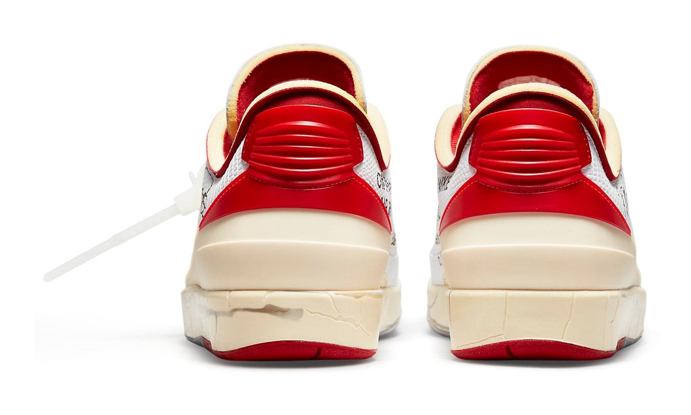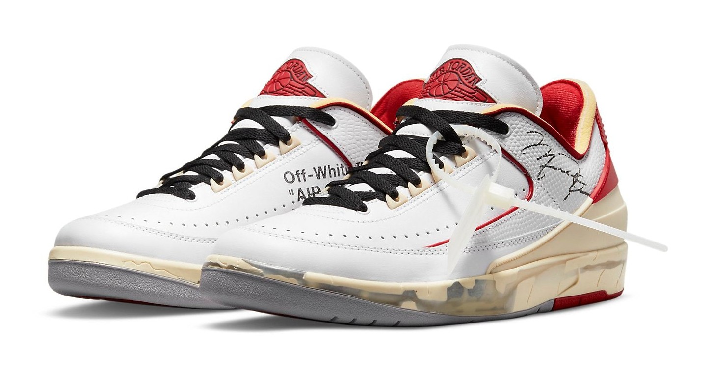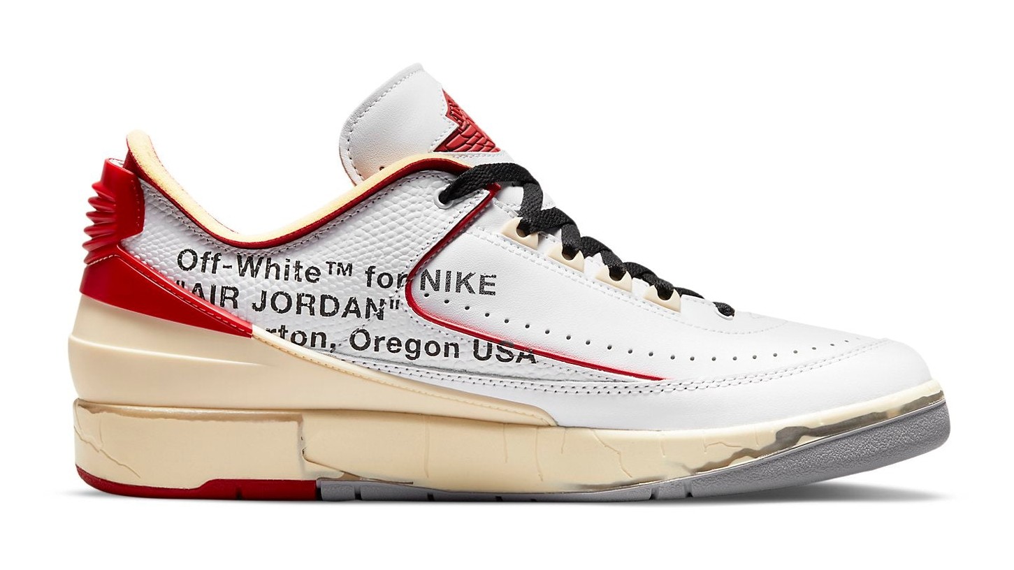 This collaboration with the late Virgil Abloh's Off-White label reimagines the Air Jordan 2 Low in the classic Chicago-inspired colors. The shoe features a White leather upper with Varsity Red piping and heel accents. The design is heavily deconstructed and aged, most notably through the artificially cracked and yellowed midsole, which uses clear, stabilizing material to simulate the crumbling of a vintage sneaker. Signature Off-White elements include the plastic zip-tie, industrial Helvetica text on the medial side, and exposed foam on the tongue and collar. A unique addition is a printed, facsimile of Michael Jordan's signature on the lateral side, adding a personal and historic touch to the collectible design.