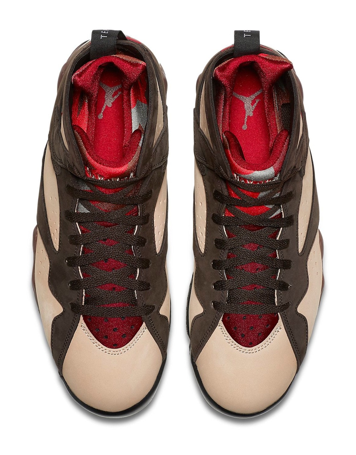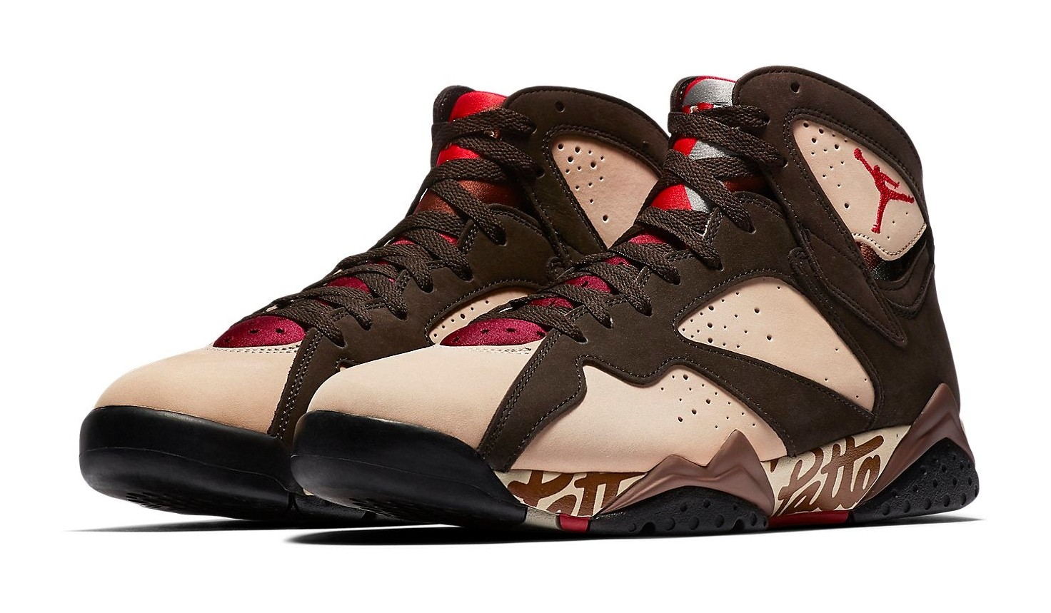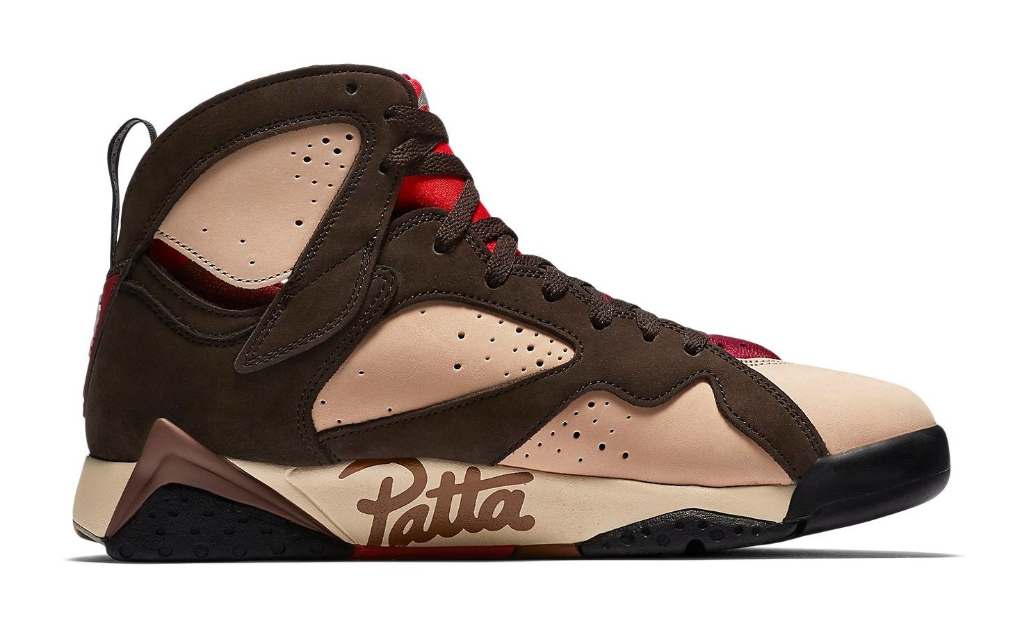 This sneaker is the first of two colorways released in the collaboration between Amsterdam-based streetwear brand Patta and Jordan Brand. The design features a premium upper with a base color of 'Shimmer' (a light tan/peach color), complemented by overlays in 'Velvet Brown' and 'Mahogany Mink' (earthy brown tones). 'Tough Red' accents are seen on the Jumpman logo and the signature geometric detailing of the Air Jordan 7 midsole. Unique to this collaboration, the word "Patta" is subtly scripted along the midsole, replacing part of the shoe's traditional graphic pattern. The shoe uses a mix of high-quality suede and nubuck on the upper.