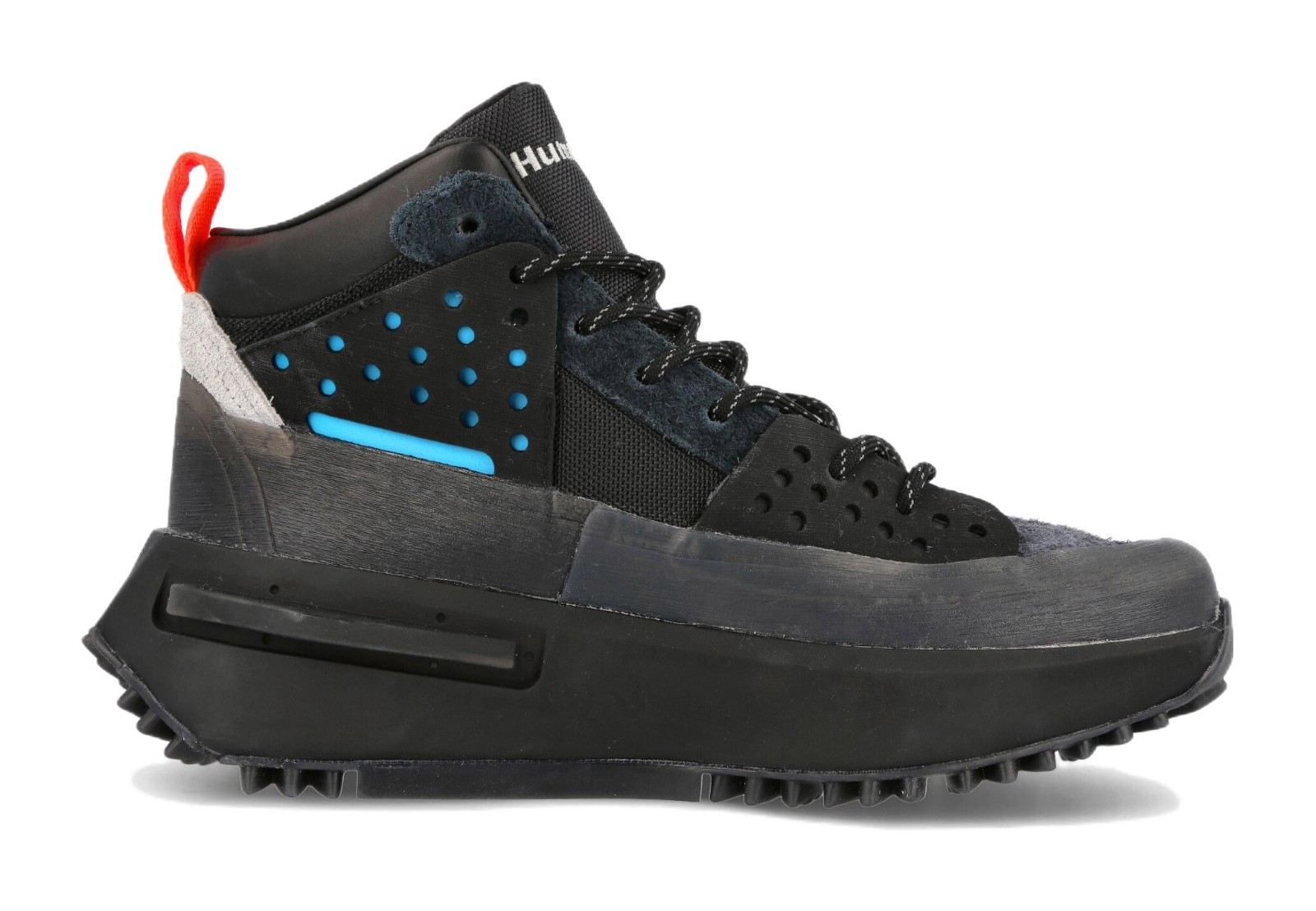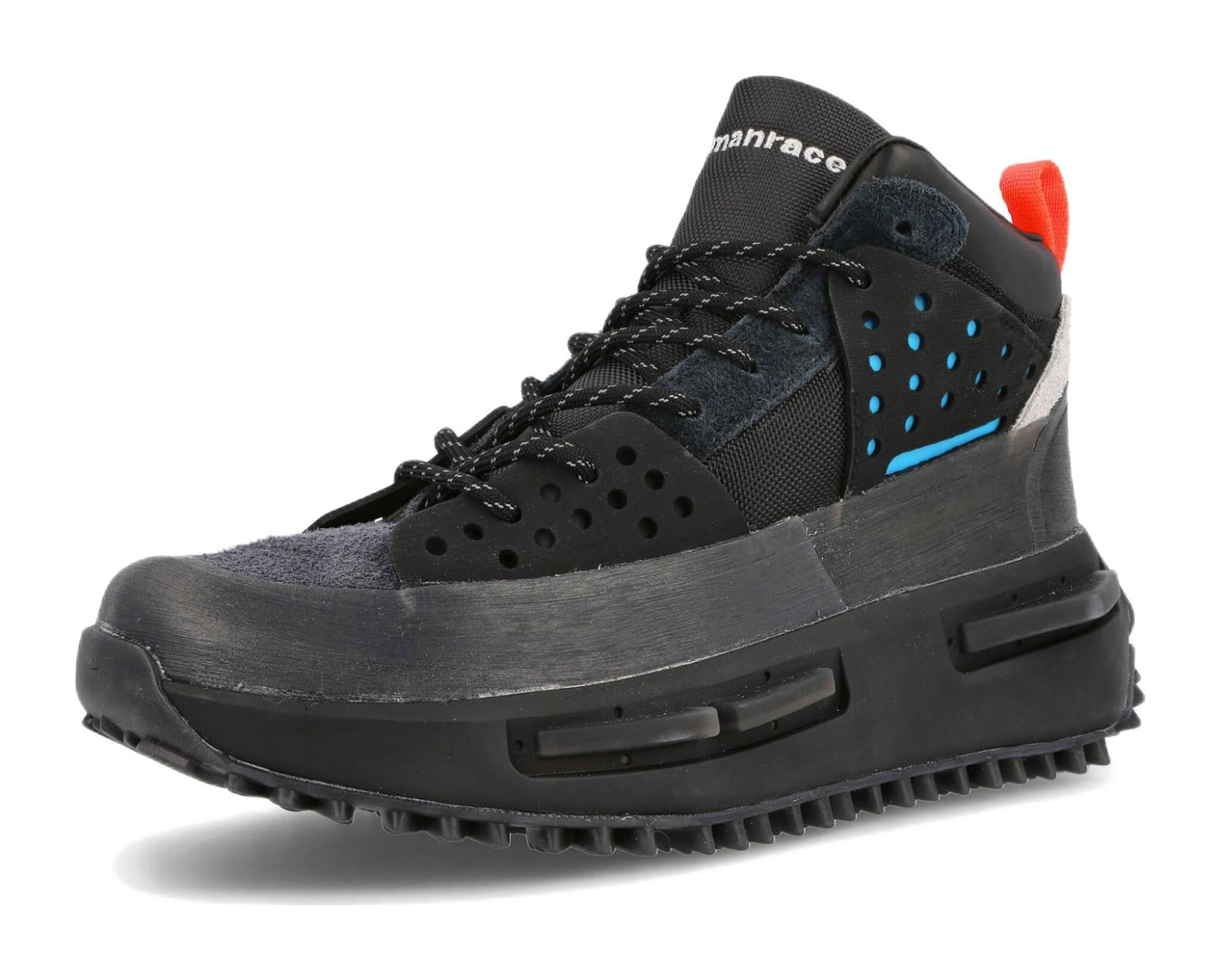 This model is part of the adidas and Pharrell Williams' Humanrace collaboration, offering a sleek, monochromatic look on the high-top, outdoor-inspired silhouette. The boot-like upper is almost entirely dressed in Core Black, utilizing a mix of premium materials like ballistic mesh, suede, and a rubberized TPU mudguard. The chunky, futuristic NMD_S1 sole unit is also black, but a bright pop of Solar Red is strategically placed on the rear outsole traction points and on one of the TPU plugs, adding a signature Humanrace color accent. The shoe incorporates a full-length BOOST midsole for energy return and cushioning.