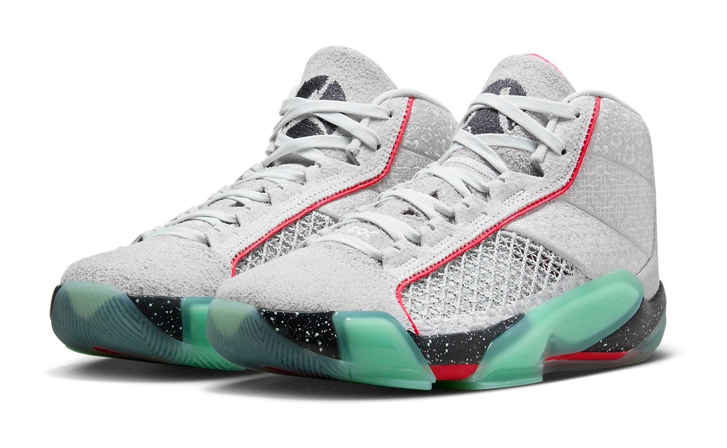 The Rui Hachimura x Air Jordan 38 is a performance basketball shoe that pays tribute to Rui Hachimura's Japanese heritage, specifically nodding to his home of Toyama Prefecture. The upper is predominantly Photon Dust (a light grey/cream color), with accents of Mint Foam, Siren Red, and Off Noir. Distinctive features include embroidered graphics on the heel, such as cherry blossoms and Japanese patterns, which nod to Hachimura's background. The toebox is covered in a shaggy suede that wraps around the heel, adding a unique texture. The left tongue features Rui Hachimura's personal logo, while the right features the classic Jumpman. The shoe incorporates the Air Jordan 38's signature performance technology, including a full-length Zoom Strobel and a Cushlon 3.0 wedge, with a translucent Mint Foam outsole completing the look.