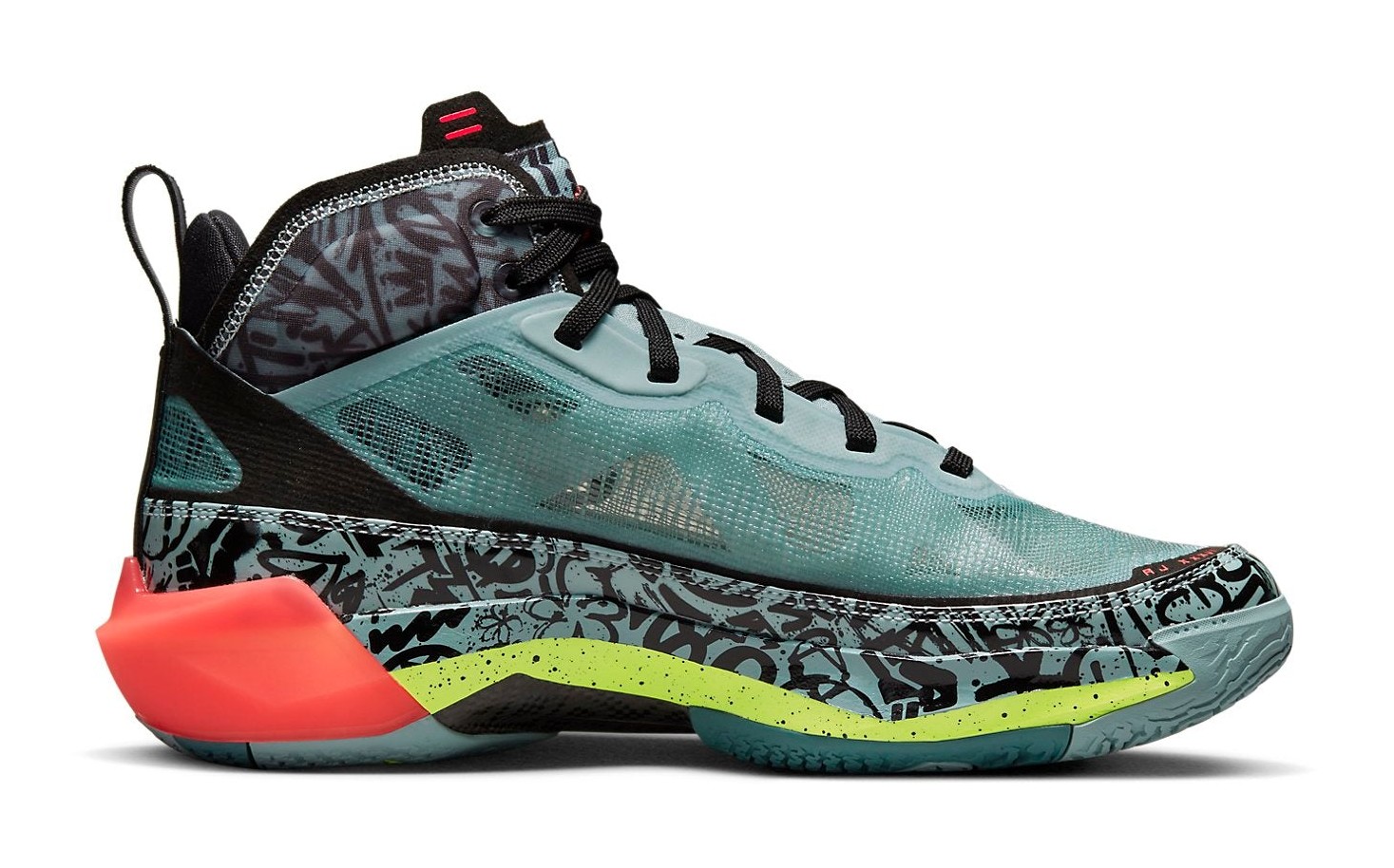 The Air Jordan 37 PF 'Graffiti' is a special Player Edition (PE) for WNBA star Satou Sabally. The sneaker, released in Women's sizing, is highly colorful and energetic, inspired by the creativity and street art of graffiti. The upper is a vibrant mix of Ocean Cube (a bright blue/green teal) and Volt (a neon yellow-green), featuring an all-over, abstract, graffiti-like pattern visible beneath the leno-weave material. Black accents provide contrast on the tongue and heel, while Flash Crimson (a hot red/pink) highlights the Jumpman logo and other details. The PF (Performance Fit) outsole is designed with extra durability for outdoor play.