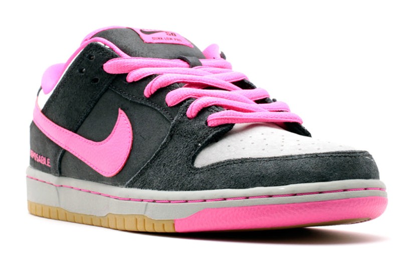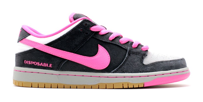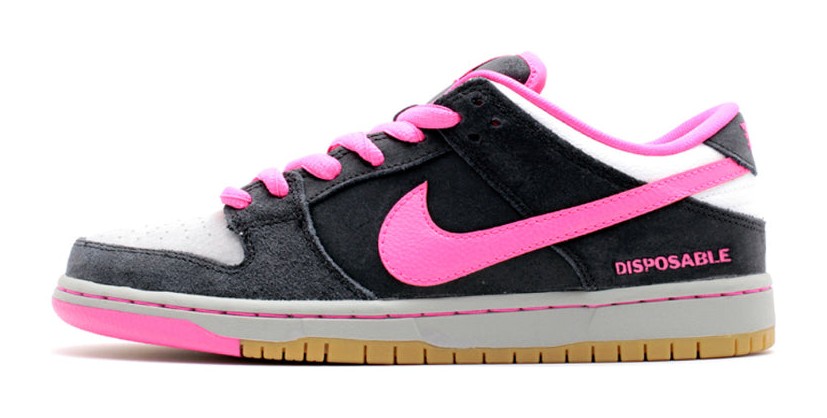 This shoe was released to commemorate the 10th anniversary of Sean Cliver's iconic book, Disposable: A History of Skateboard Art. The design is inspired by the book's cover, featuring a combination of Black suede on the upper with a light grey suede toe box. Pink Foil (a vibrant magenta) provides striking pops of color on the Swoosh, laces, and collar lining. The word "Disposable" is embroidered on the lateral heel. The shoe is completed with a Gum outsole.