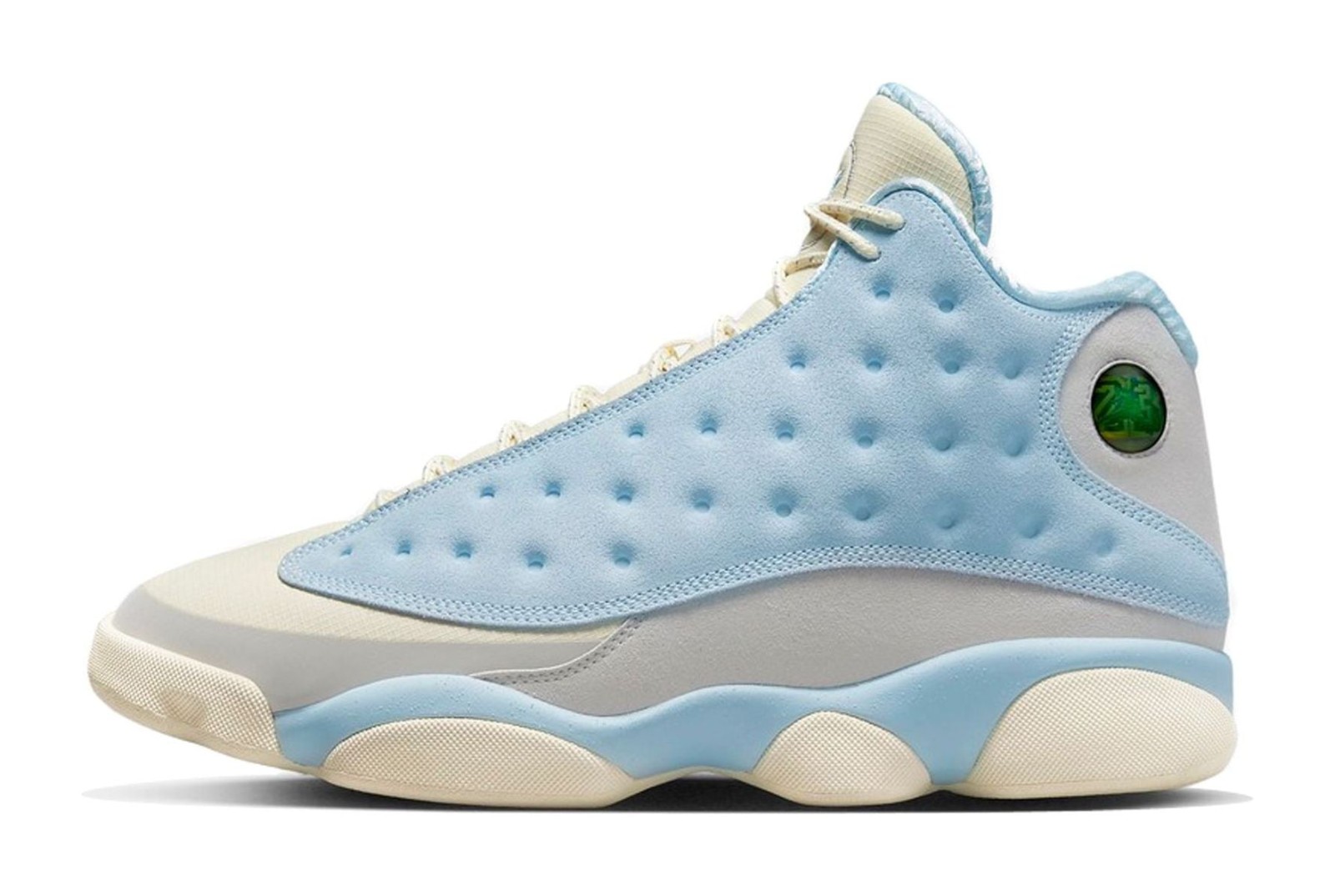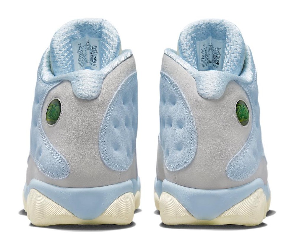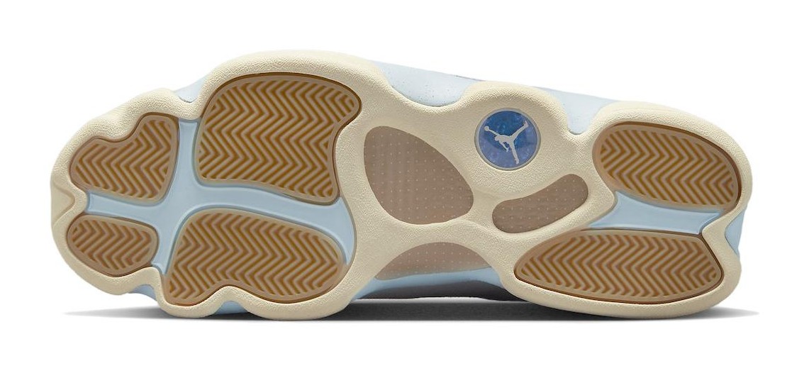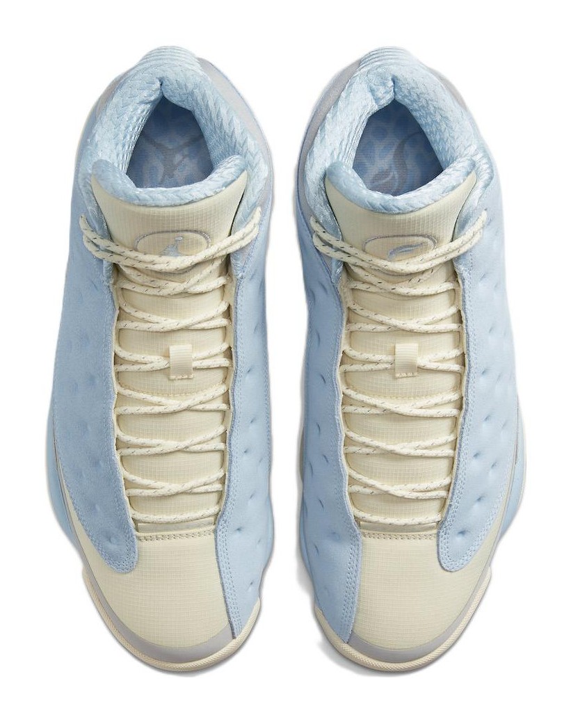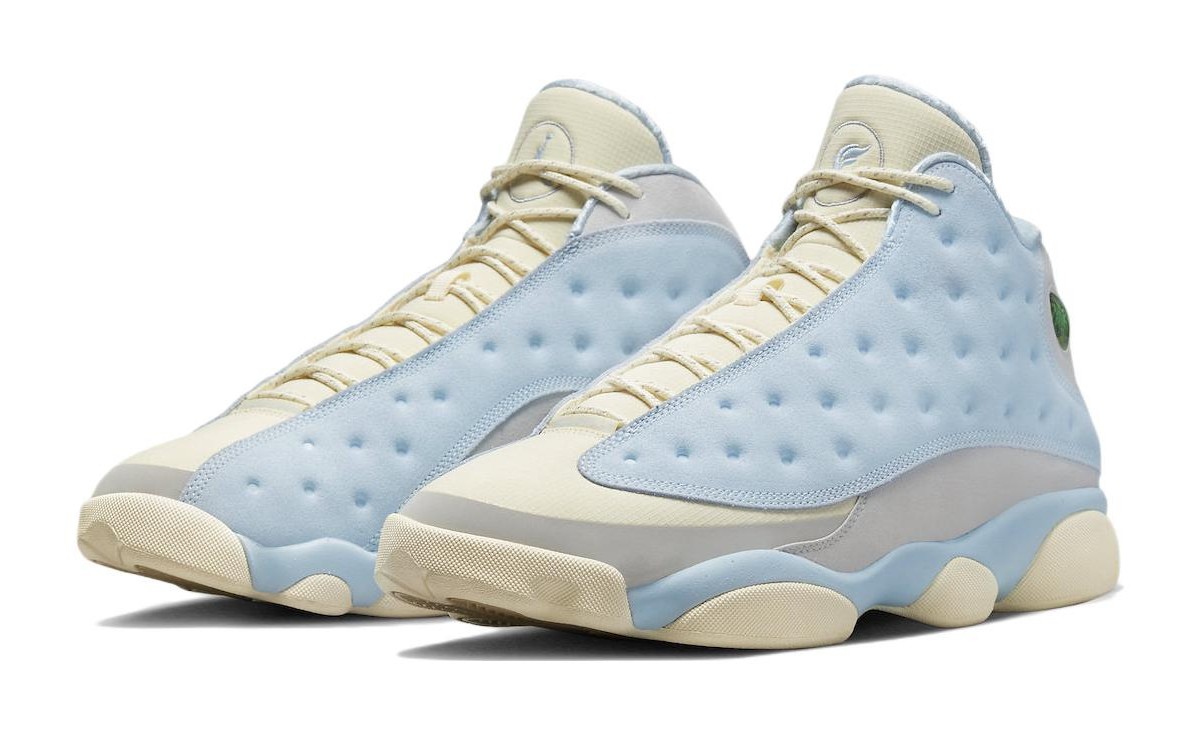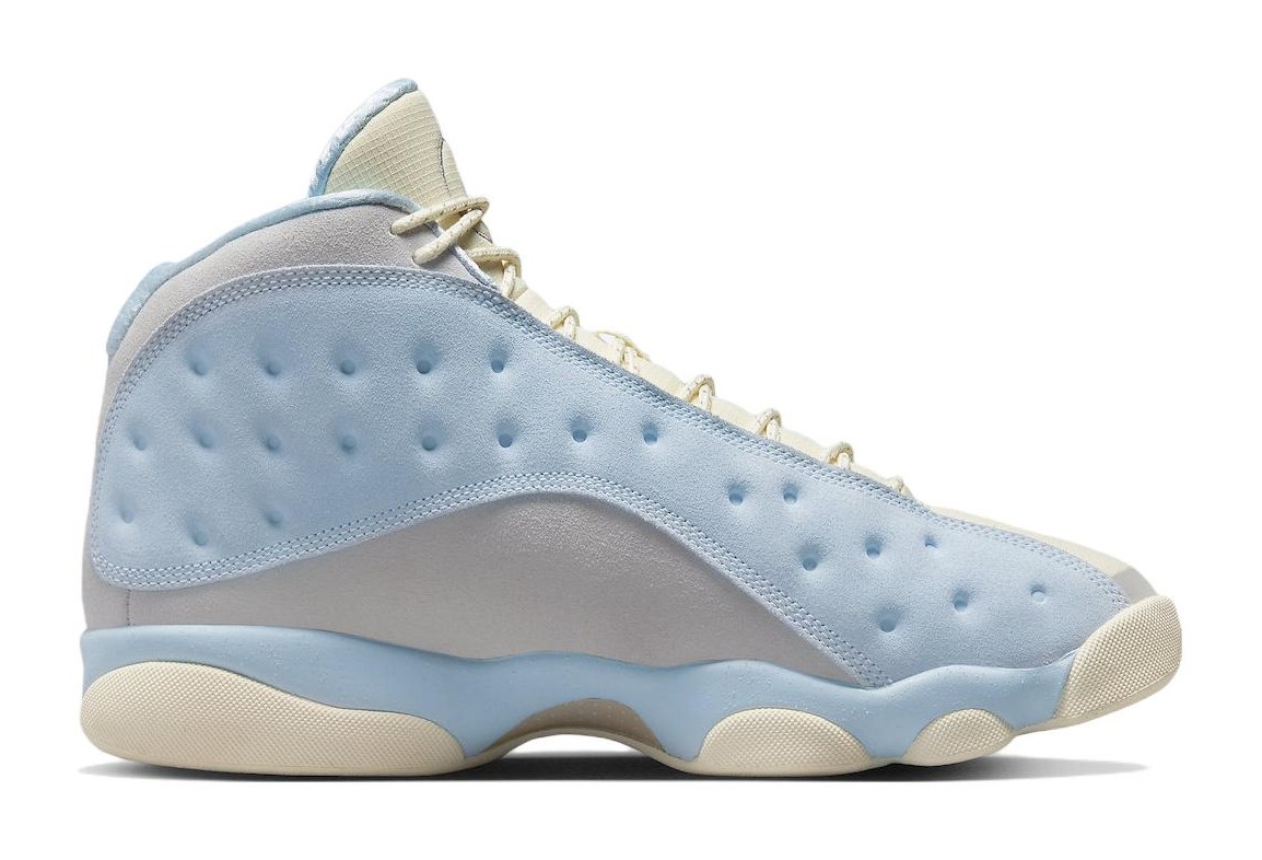 This collaboration with Miami-based retailer SoleFly delivers a unique, light-hued take on the Air Jordan 13. The design is inspired by the swampy environment of the Everglades and features a mix of Muslin-colored ripstop textile for the dimpled panels and Light Smoke Grey suede overlays. The Celestine Blue color is prominently used on the fuzzy suede mudguard and heel. Unique co-branded details include an elephant print graphic on the sockliner and mismatched logos on the tongues, with the Jumpman on one shoe and the SoleFly logo on the other. The look is finished with a Gum Light Brown rubber outsole.