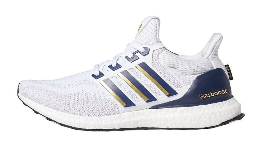 This shoe honors NFL wide receiver Stefon Diggs, drawing inspiration from his high school days with a color scheme of white, indigo blue, and metallic gold. The Primeknit upper is primarily Cloud White, contrasted by the Indigo blue on the supportive midfoot cage and the Continental™ Rubber outsole. Gold Metallic accents the heel counter and the UltraBOOST lettering. The shoe is a DNA model, celebrating the classic 2.0 Primeknit pattern, and features the player's personalized surname and high school details subtly woven into the design.