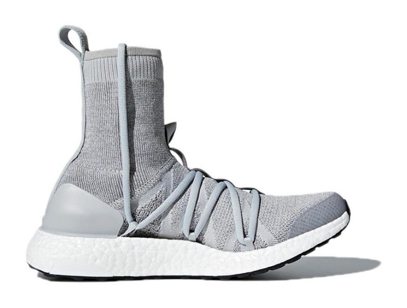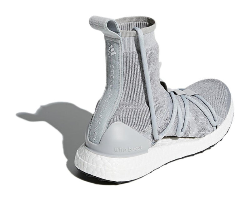 This is a women's performance running and lifestyle shoe, a collaborative design with British fashion designer Stella McCartney. It takes the classic UltraBoost X silhouette, which features a floating arch construction, and extends the Primeknit upper into a sock-like mid-cut collar for extra warmth and a distinctive aesthetic. The Primeknit upper is a mix of grey and stone colors, resting atop a full-length white BOOST midsole and a grey outsole. The shoe combines a high-fashion look with high-performance technology, including the adaptive arch and energy-returning BOOST cushioning.