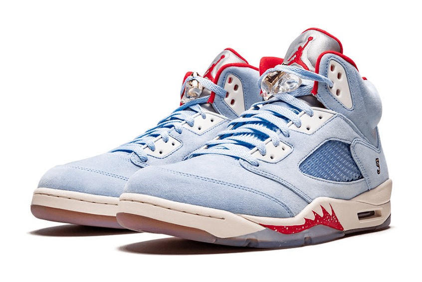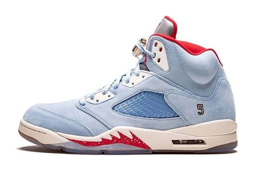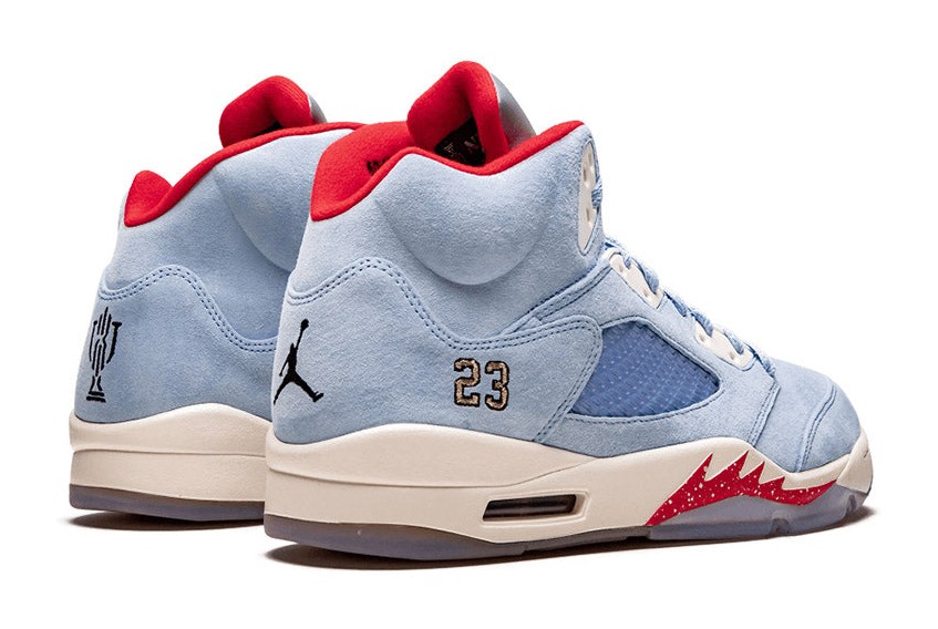 The Trophy Room x Air Jordan 5 Retro SE 'Ice Blue' is a collaboration with Trophy Room, a sneaker boutique owned by Marcus Jordan, Michael Jordan's son, and is inspired by the trophy room in the Jordan family home. The shoe features an upper constructed from premium Ice Blue suede. Accents include University Red on the lining, tongue trim, and a small Jumpman logo, while Metallic Gold appears on the lace lock and branding. The heels are embroidered with Michael Jordan's number '23' on the right shoe and Marcus Jordan's number '5' on the left. The translucent rubber outsole reveals a unique wood-grain graphic, referencing the flooring of the trophy room. This release was limited to 7,000 individually numbered pairs.