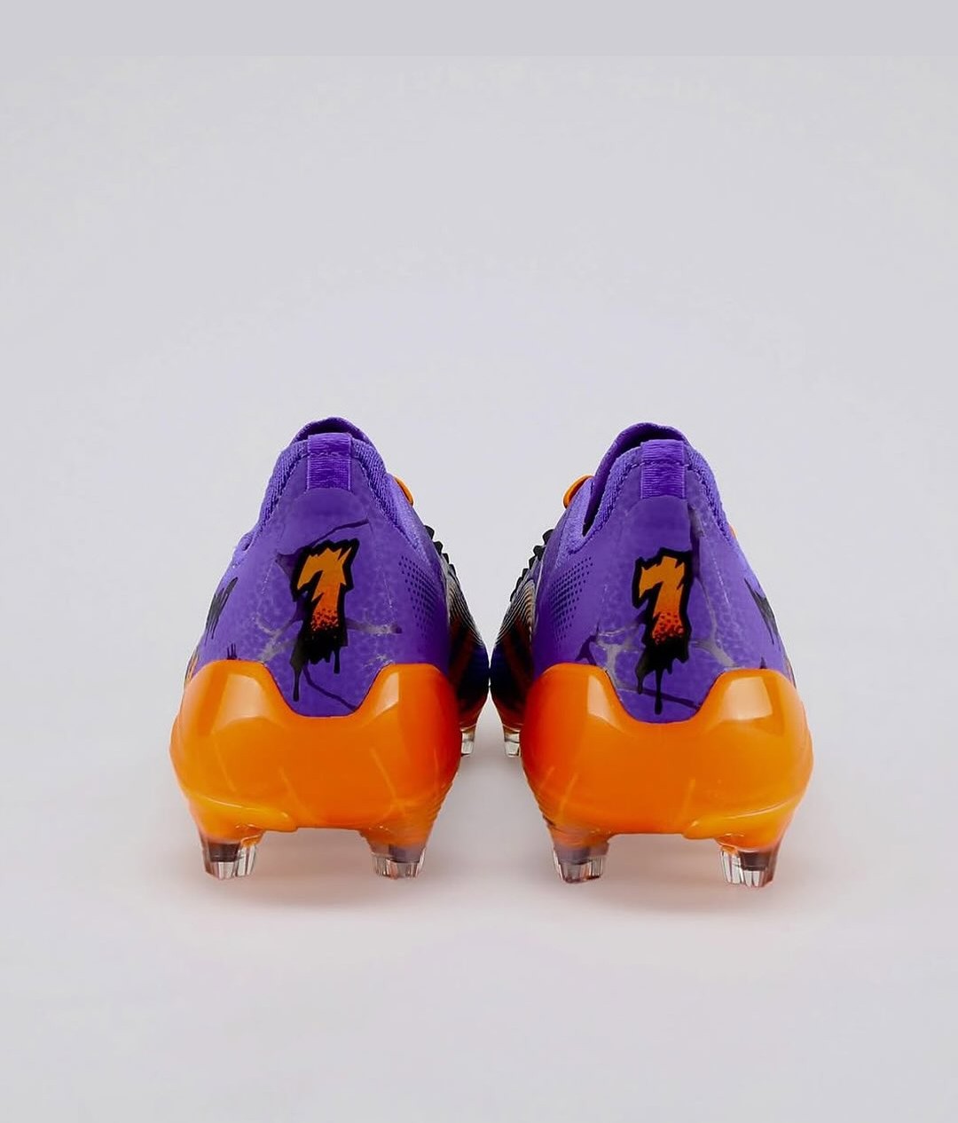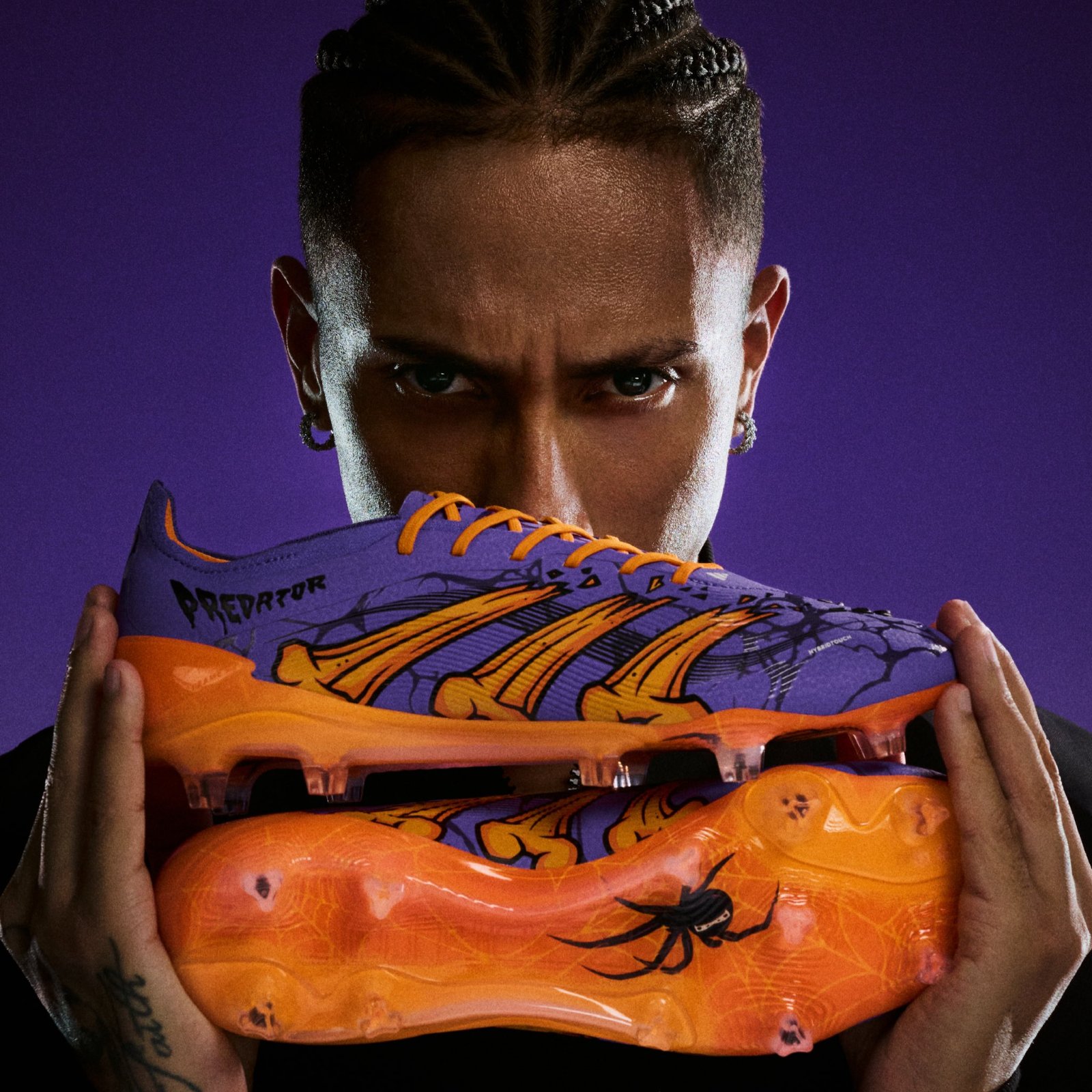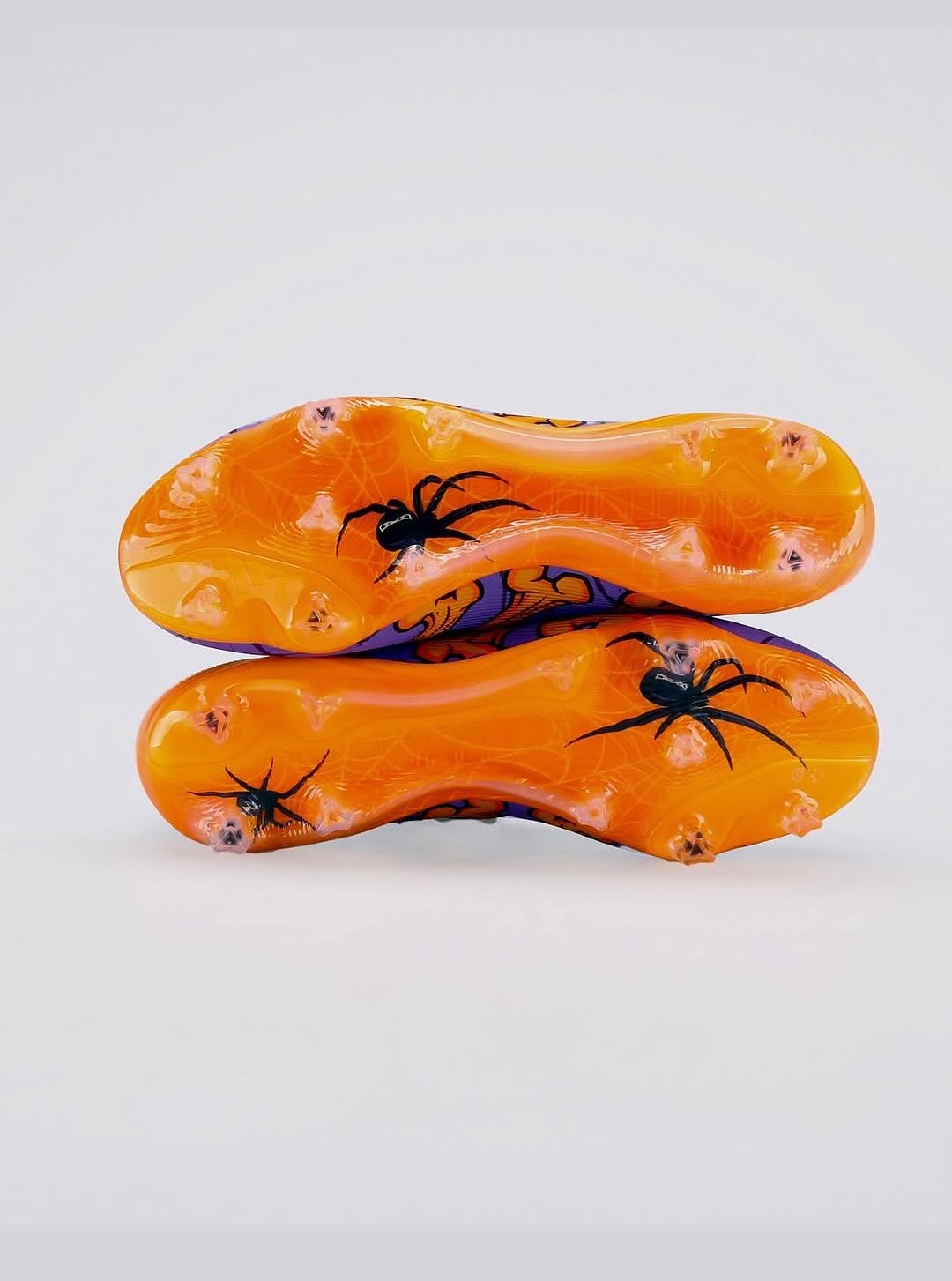 The Adidas x UFL Predator Cursebreaker soccer cleats pair a vivid mix of orange and purple with sharp black detailing, including web-like graphics and a small spider motif on the soleplate.