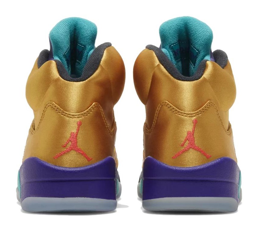 The Air Jordan 5 Retro 'Fresh Prince of Bel-Air' Friends & Family (MNJDLS-818) is an ultra-rare, unreleased version created for actor Will Smith to celebrate his 50th birthday. It pays homage to the vibrant, mismatched style of his character on the TV show The Fresh Prince of Bel-Air. The sneaker features a luxurious gold satin upper, which is distinct from the general release versions. The tongue displays the classic 'Grape' color scheme with purple and teal, while the midsole features additional purple and teal accents and speckled 'shark teeth.' An Infrared Jumpman logo is placed on the heel, and the design is finished with a translucent outsole. Only an estimated 23 to 25 pairs were produced, making it a highly exclusive collector's item with no official retail price.